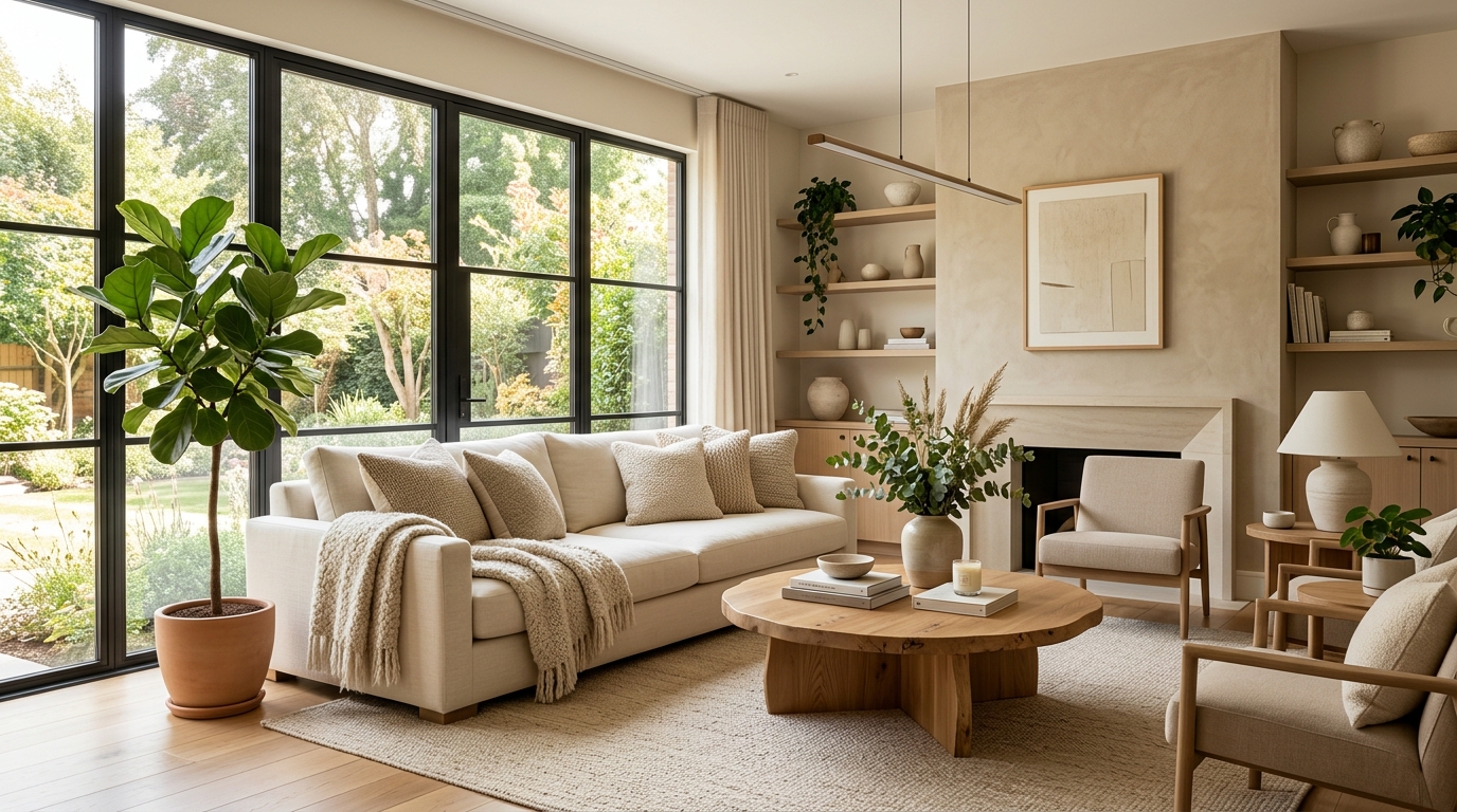 Бежевая гостиная с терракотовыми и зелёными акцентами — тепло и характер одновременно