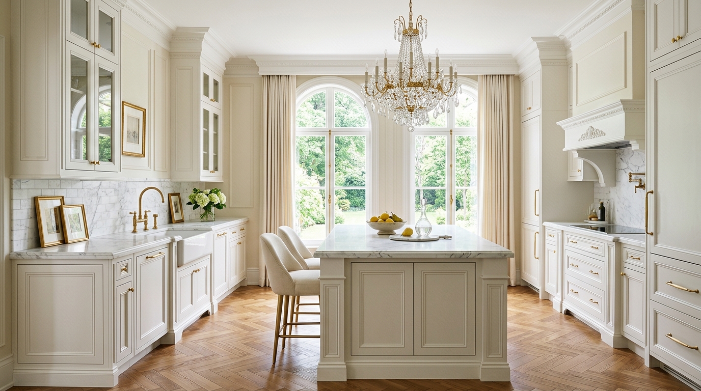 - Филёнчатые (рамочные) фасады — визитная карточка стиля. Рамка с внутренней панелью создаёт объём и ритм. Предпочтительна неглубокая, лаконичная фрезеровка — не барочная, а сдержанная.