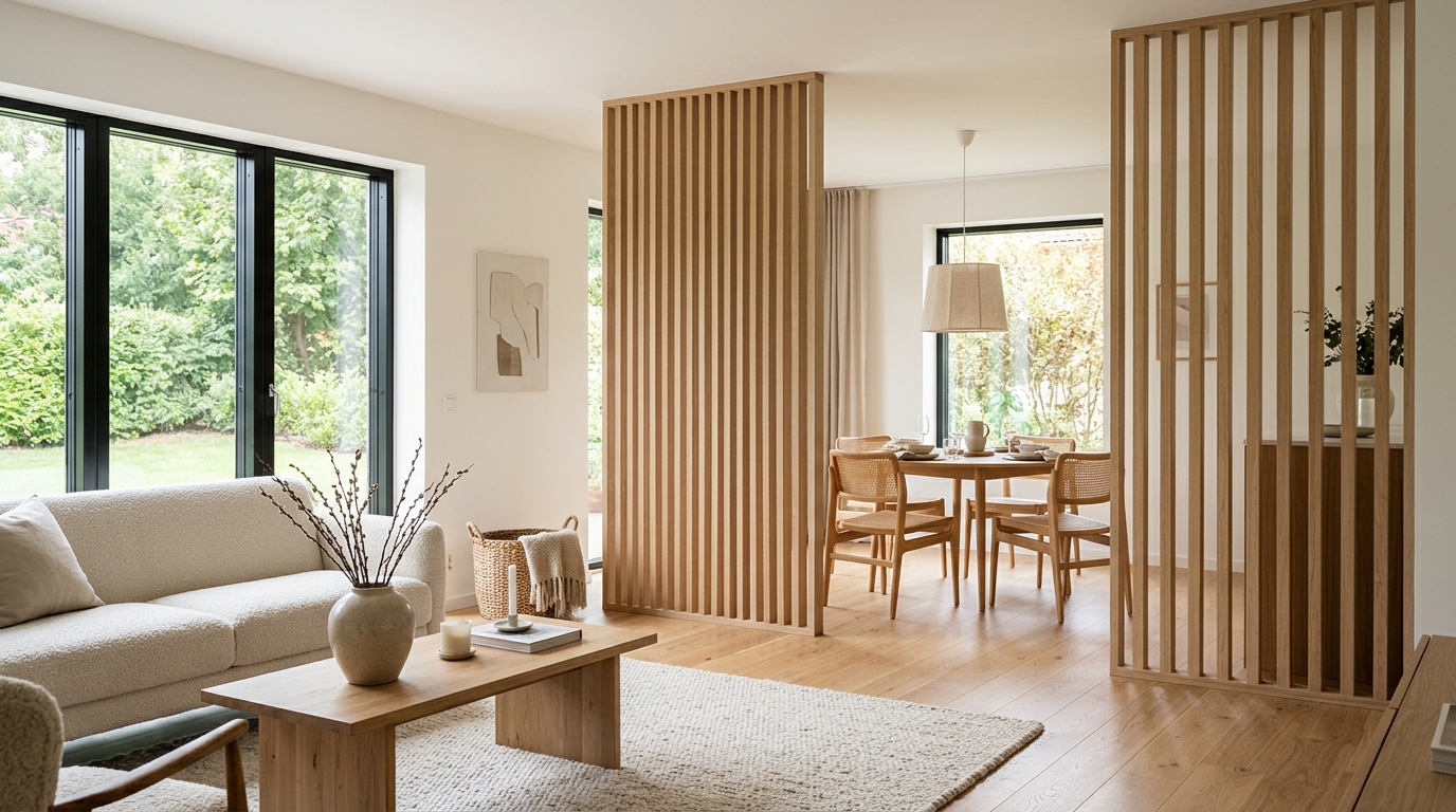 Реечная перегородка из светлого дерева — пропускает свет и создаёт ощущение приватности