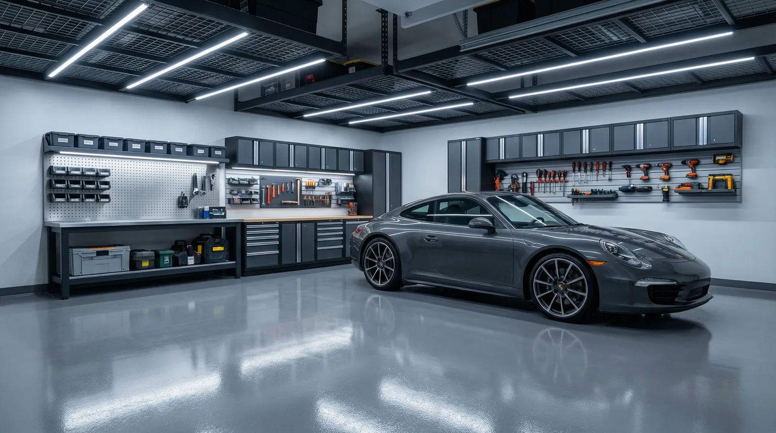 Пол — самый нагруженный элемент. Полимерный наливной пол — оптимальный баланс цены и качества: он не пылит, легко моется, выдерживает вес автомобиля. Эпоксидка — декоративнее, но дороже. Плитка из керамогранита — элитный вариант, но требует качественного основания. Резиновые модульные покрытия — быстро укладываются и гасят шум.