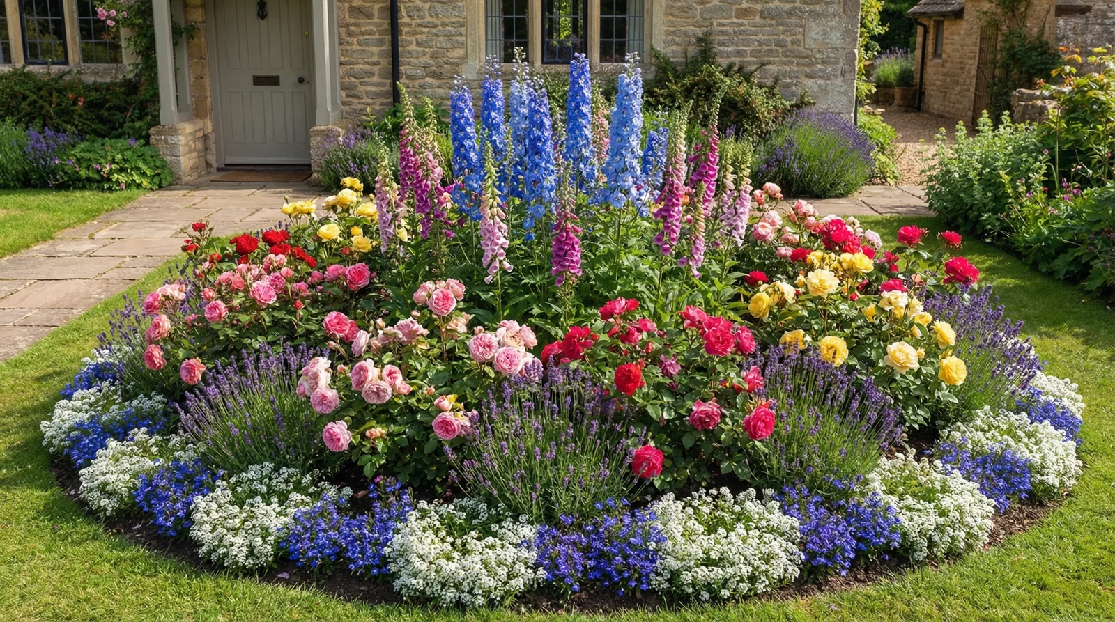 При подборе растений для российского климата (зоны USDA 3-5) учитывайте не только цвет, но и сроки цветения. Надёжный «скелет» клумбы: весна — тюльпаны, нарциссы, примула; раннее лето — ирисы, пионы, люпины; разгар лета — розы, лилейники, флоксы; конец лета — эхинацея, рудбекия, гелениум; осень — астры, хризантемы, очитки видный. Между многолетниками высаживают однолетники-наполнители (петунии, бархатцы, космея), чтобы закрыть пустоты в первые годы.