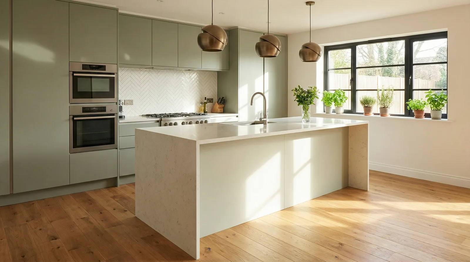 В этом году в тренде натуральные оттенки: тёплый бежевый, оливковый, терракотовый. Матовые фасады с тактильной текстурой, интегрированные ручки и столешницы из спечённого камня. Чёрная и золотая фурнитура как акцент. Всё больше кухонь проектируют с открытыми полками и элементами «живой» зелени.