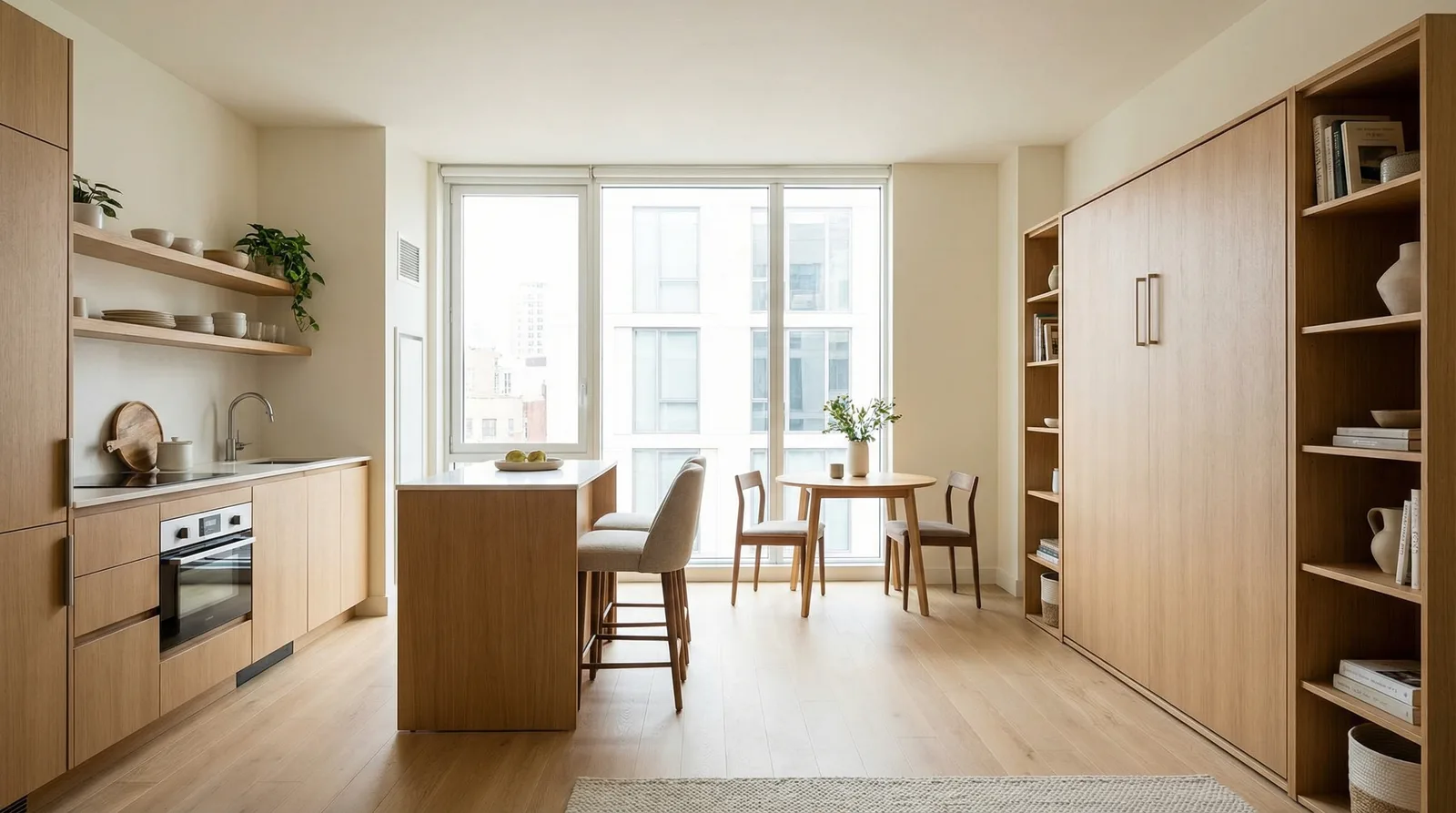 В компактной студии каждый предмет мебели должен быть многофункциональным. Диван-кровать с ящиком для хранения, откидной стол на стене, встроенный шкаф-купе до потолка, подиум со спальным местом и ящиками внутри — всё это помогает разместить максимум вещей без захламления пространства.