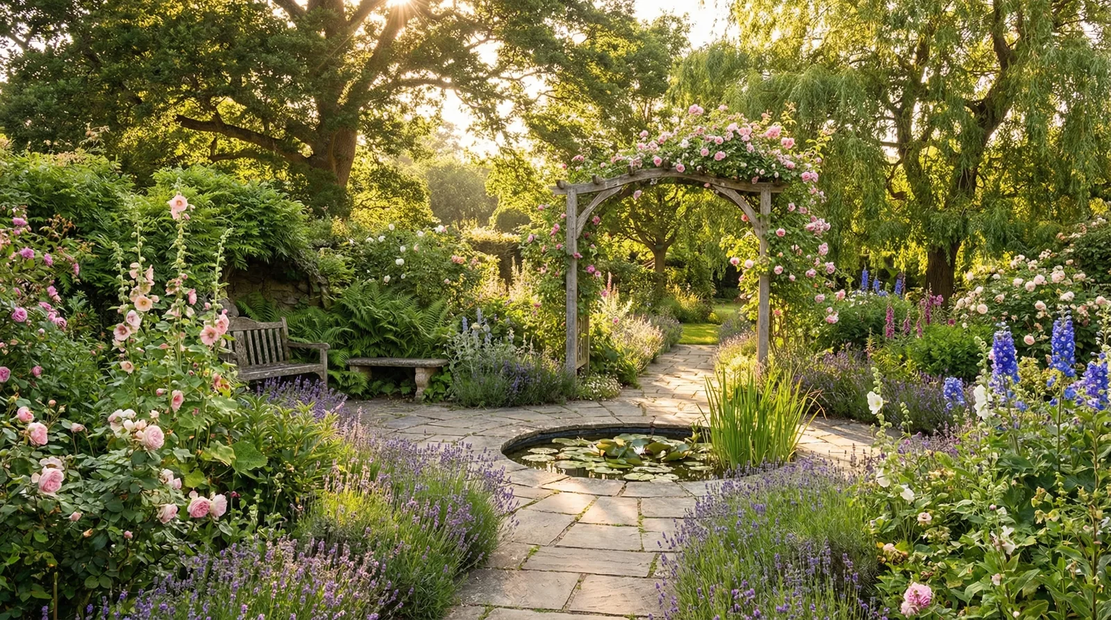 Английский пейзажный сад — имитация природного ландшафта с извилистыми дорожками, живописными группами деревьев, миксбордерами и романтичными скамейками. Главный принцип — никаких прямых линий. Газон плавно перетекает в цветник, деревья создают естественные кулисы, а водоём с кувшинками становится композиционным центром.