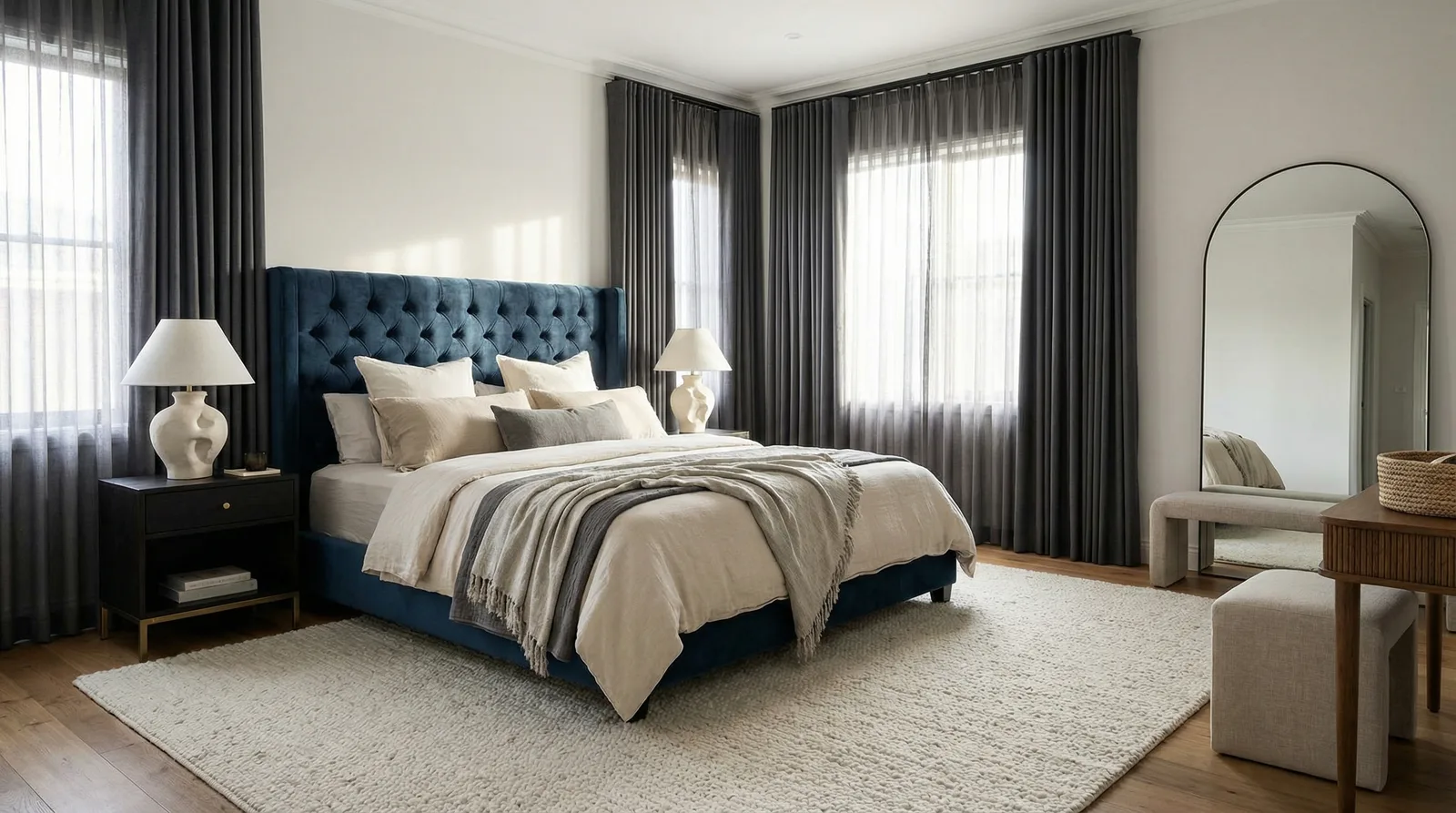 Неоклассика — молдинги на стенах, симметричная расстановка мебели, бархатное изголовье, элегантные прикроватные светильники. Сдержанная роскошь без излишеств.