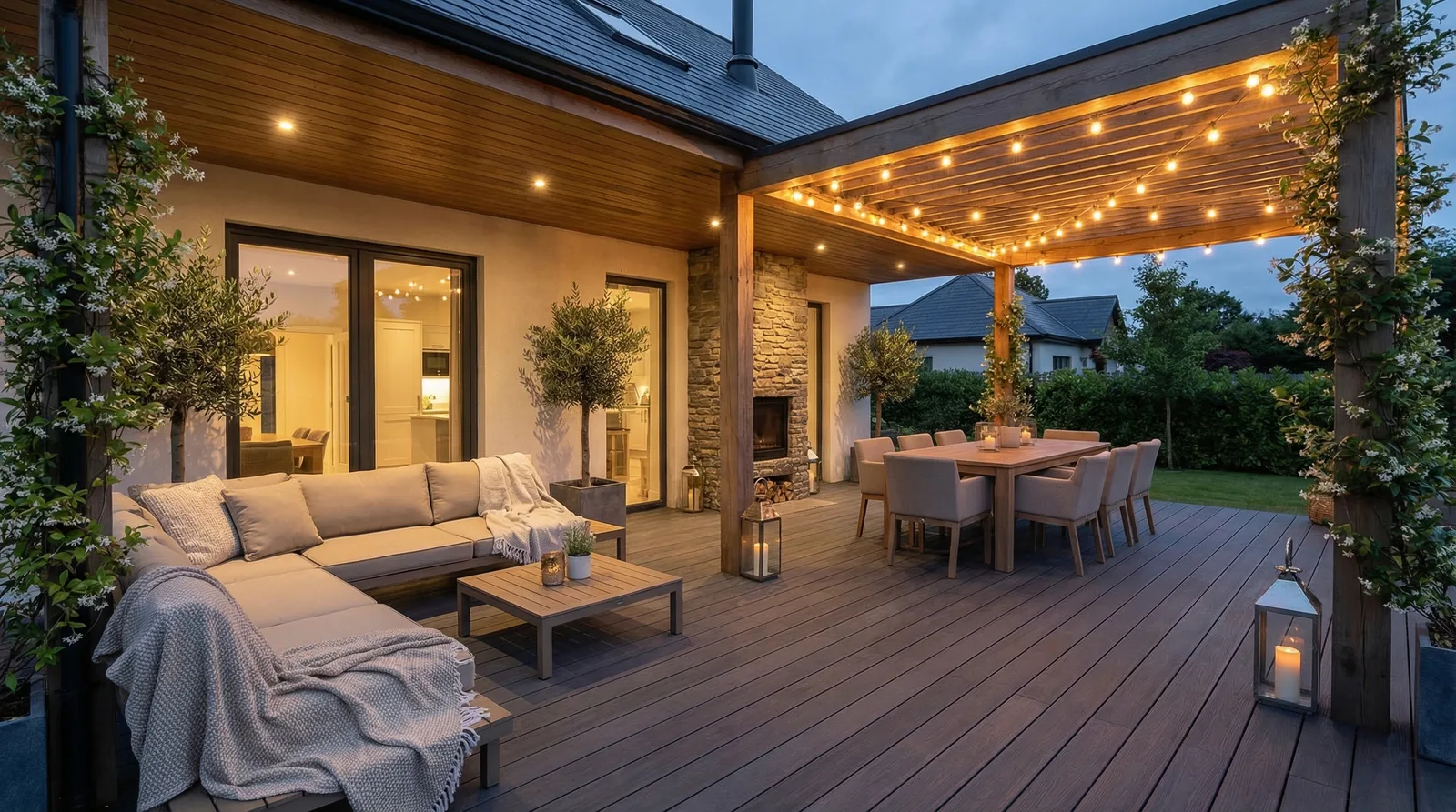 Комбинированная терраса — часть площадки под крышей, часть — на открытом воздухе. Крытая зона с мягкой мебелью и обеденным столом, открытая — с кострищем, шезлонгами или джакузи. Такой формат даёт максимальную гибкость использования и выглядит эффектнее однородной площадки.