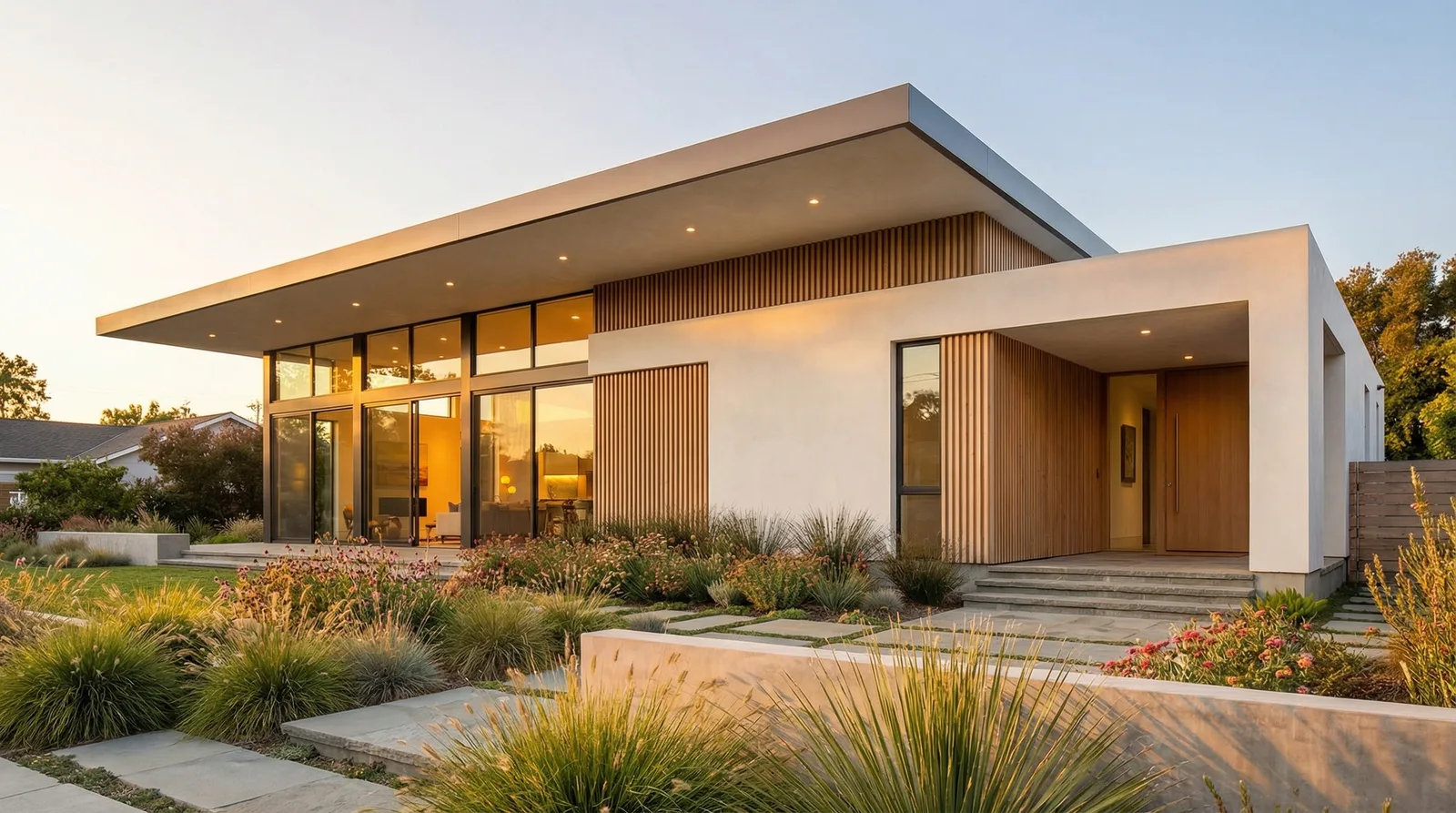 Окна — второй по значимости элемент. Для одноэтажного дома оптимальны большие окна до пола или с низким подоконником. Панорамное остекление визуально поднимает фасад и впускает максимум света. Группировка окон в ленточные горизонтальные полосы подчёркивает протяжённость дома.