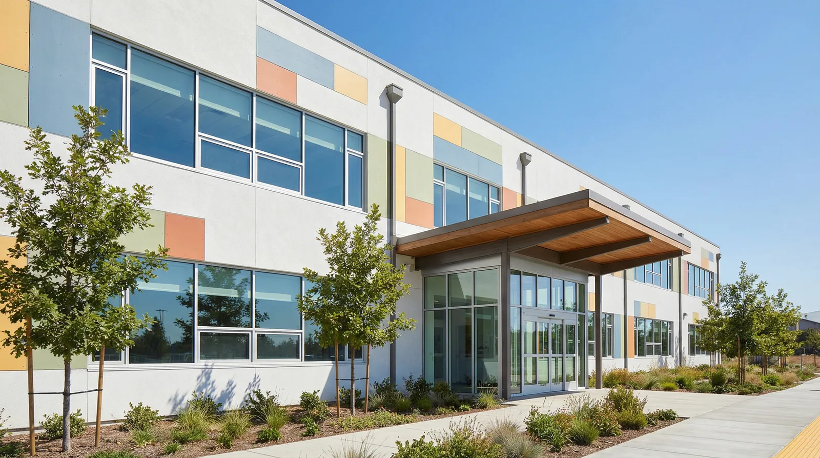 Требования СанПиН и рекомендации Минпросвещения устанавливают общие рамки для оформления фасадов образовательных учреждений. Цвета должны быть спокойными, не раздражающими и не утомляющими зрение. Это не означает, что школа обязана быть серой или бежевой — речь о балансе между выразительностью и комфортом восприятия.