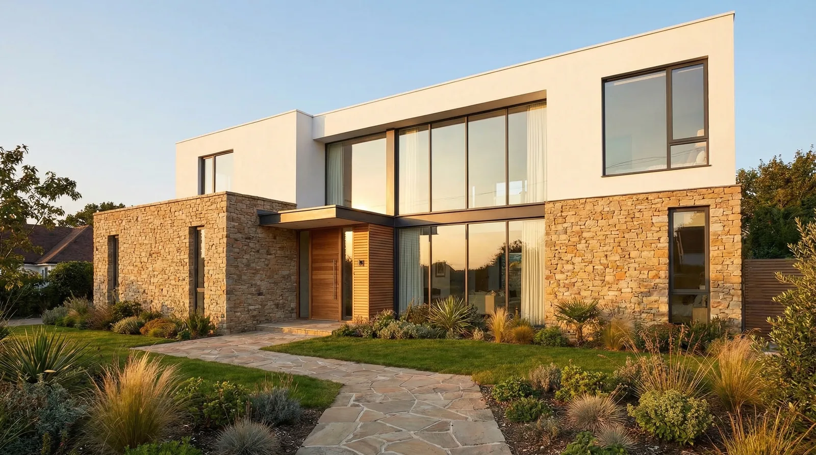 Комбинированные фасады — самый популярный подход в 2026 году. Сочетание двух-трёх материалов позволяет зонировать фасад, подчеркнуть архитектурные элементы и создать уникальный облик дома. Классические комбинации: камень + штукатурка, кирпич + дерево, штукатурка + фиброцемент. Правило — тяжёлый материал внизу, лёгкий вверху.