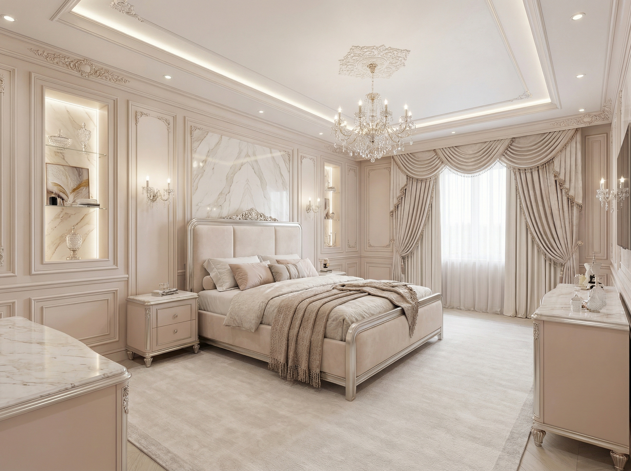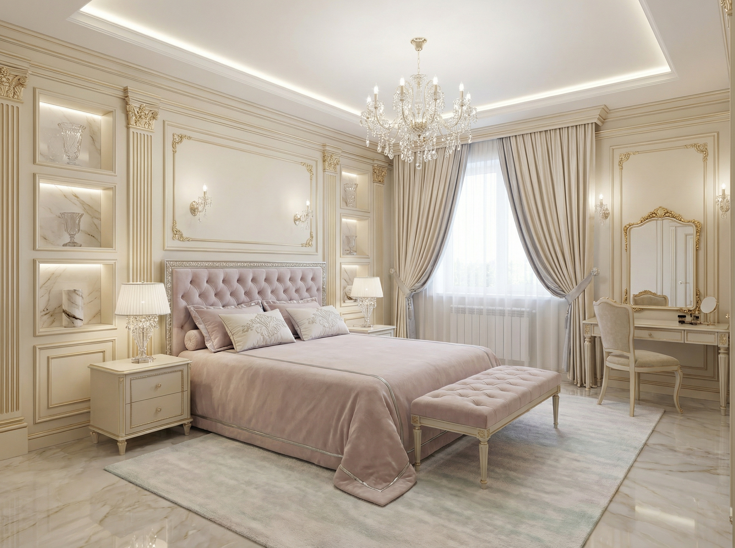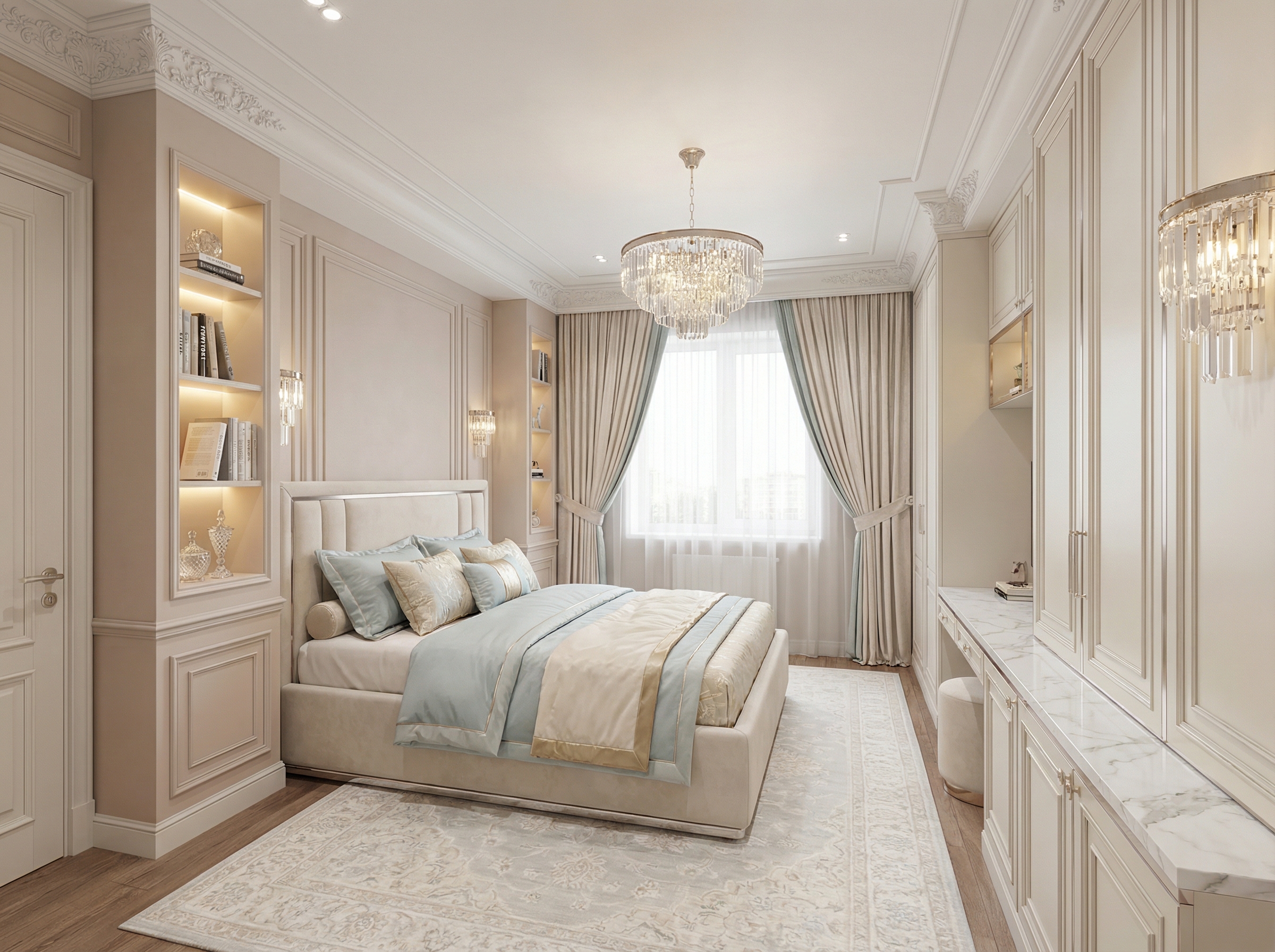 Утончённый стиль с симметрией, лепниной и благородными материалами. Классический интерьер сочетает роскошь и сдержанность, создавая атмосферу вневременной элегантности.