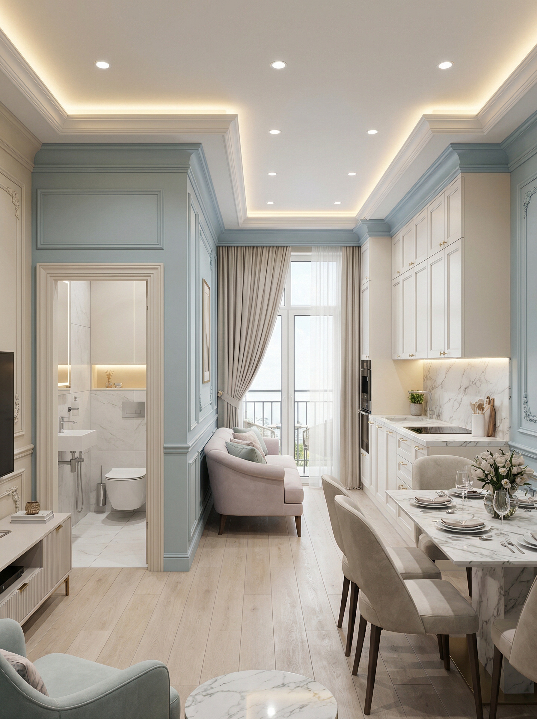 Утончённый стиль с симметрией, лепниной и благородными материалами. Классический интерьер сочетает роскошь и сдержанность, создавая атмосферу вневременной элегантности.