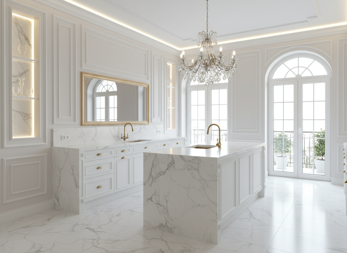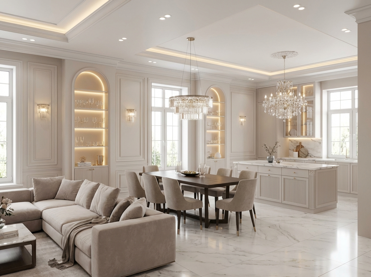 Утончённый стиль с симметрией, лепниной и благородными материалами. Классический интерьер сочетает роскошь и сдержанность, создавая атмосферу вневременной элегантности.