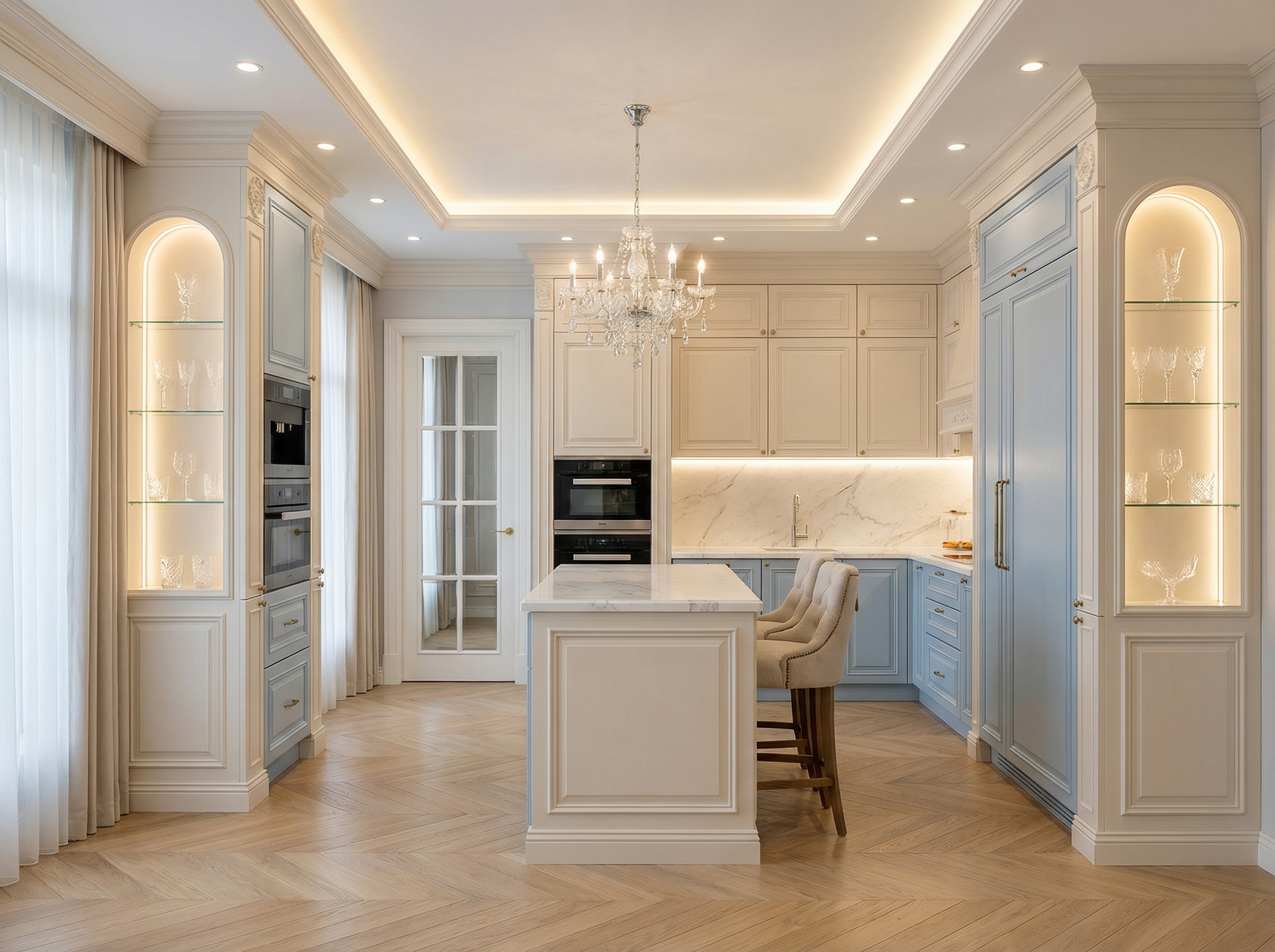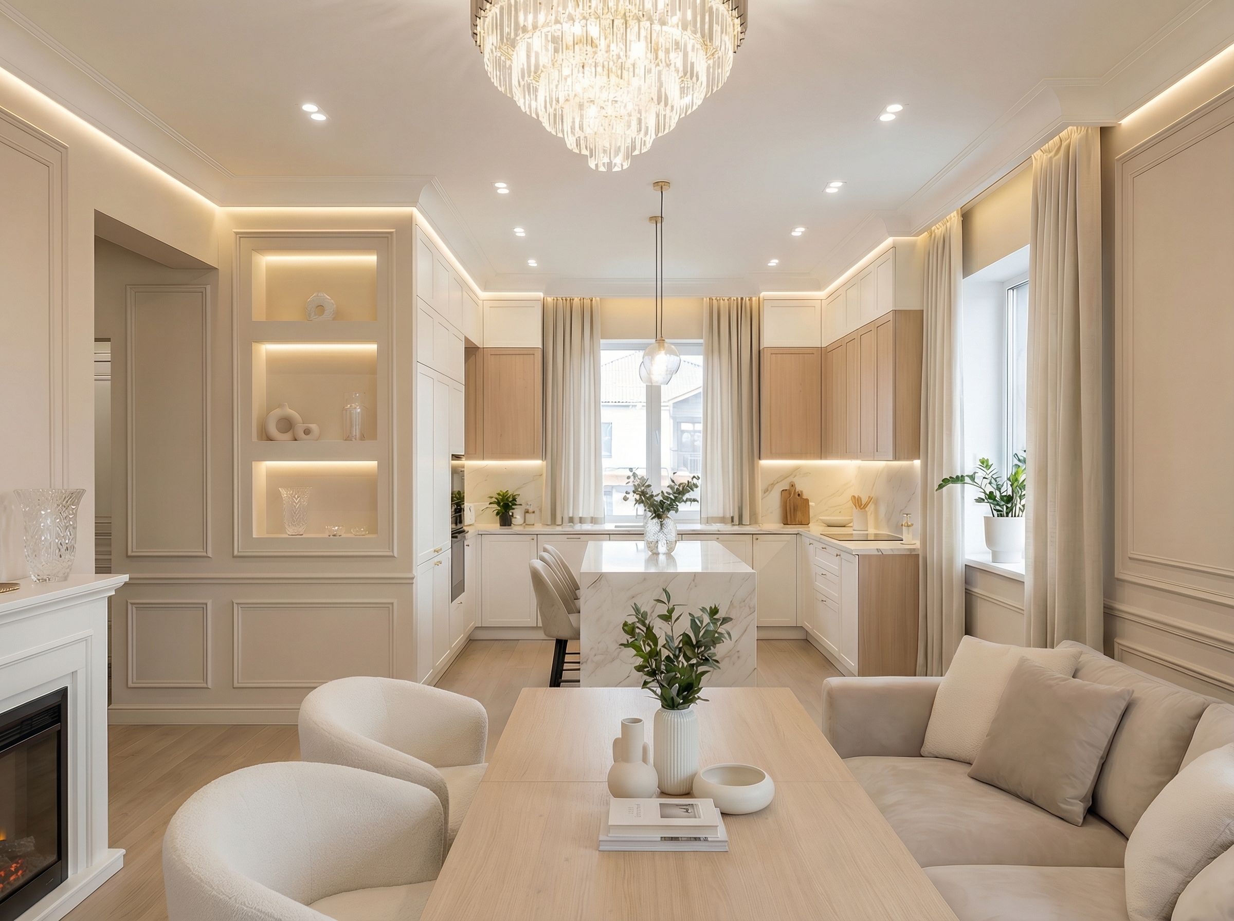Утончённый стиль с симметрией, лепниной и благородными материалами. Классический интерьер сочетает роскошь и сдержанность, создавая атмосферу вневременной элегантности.
