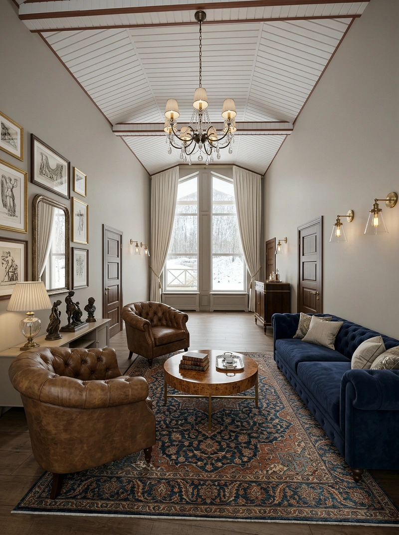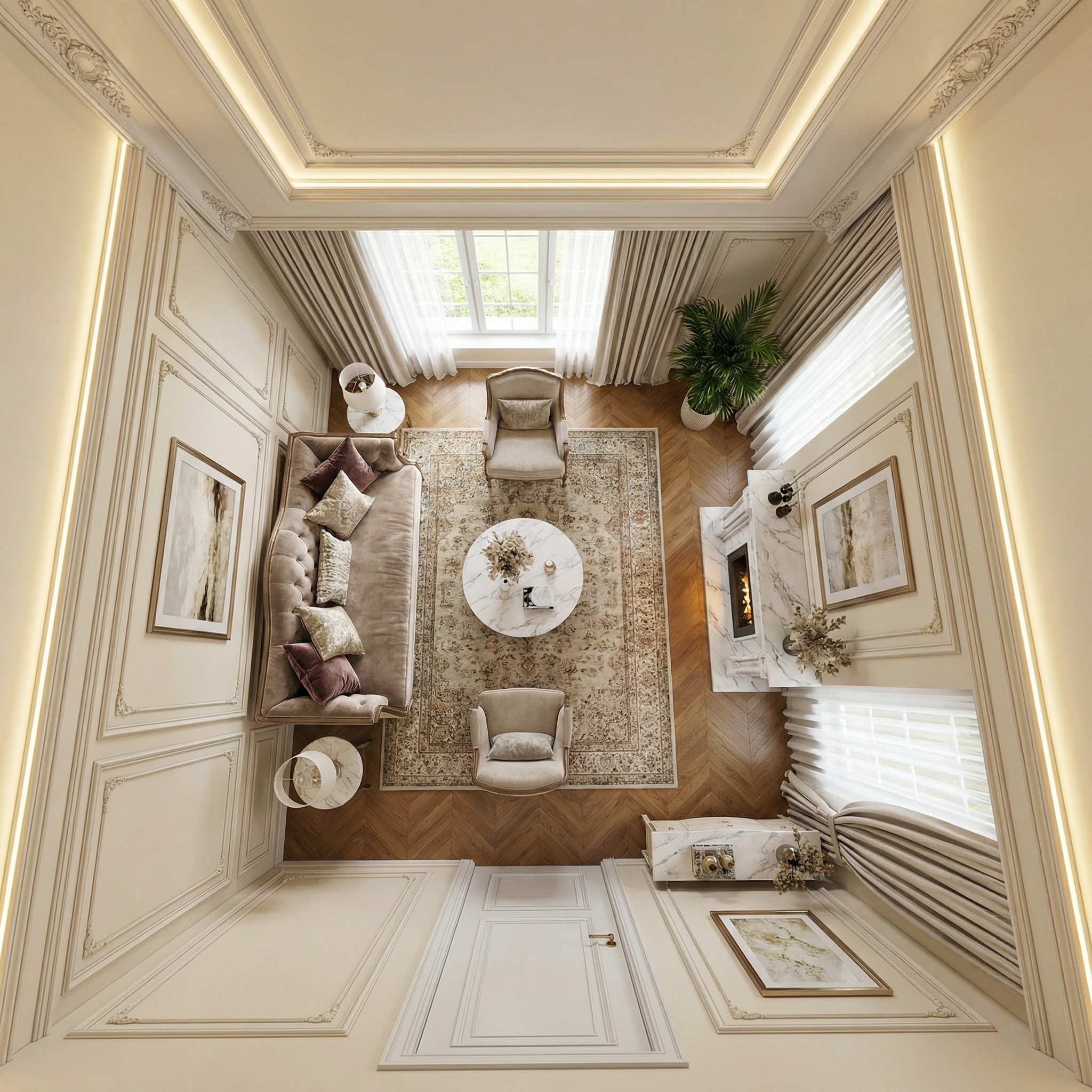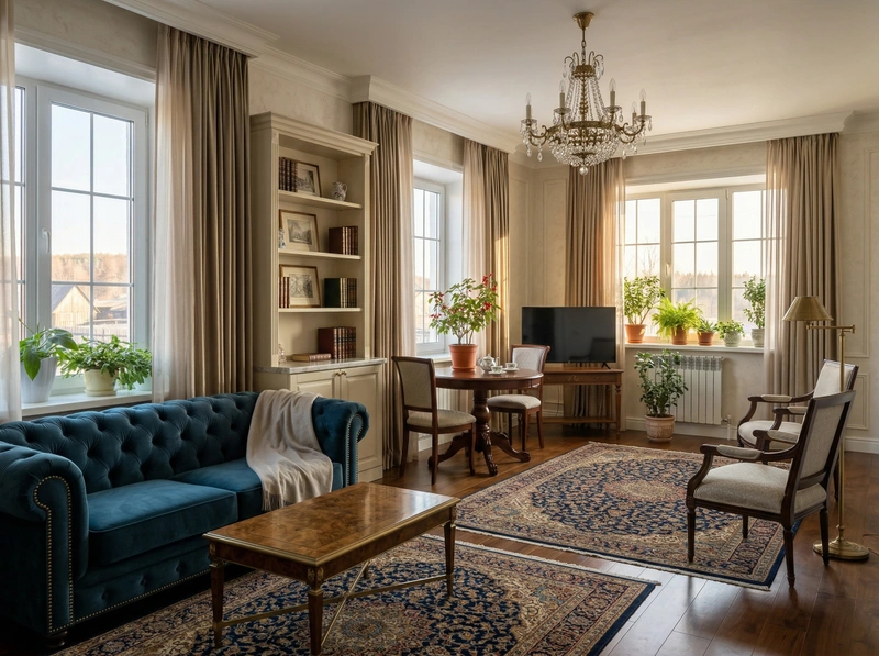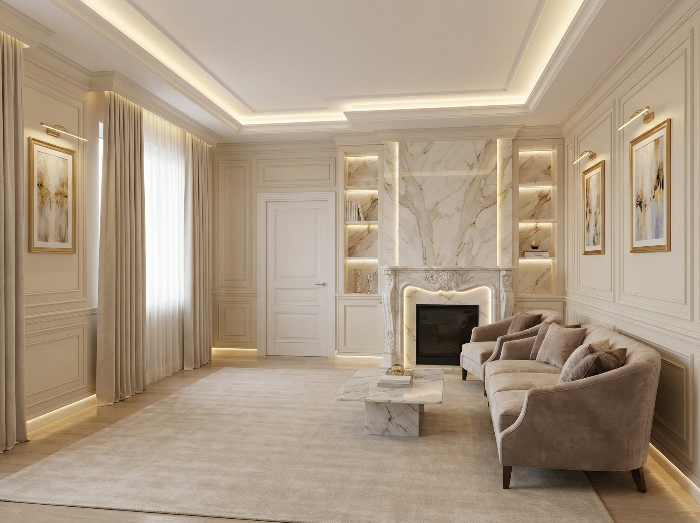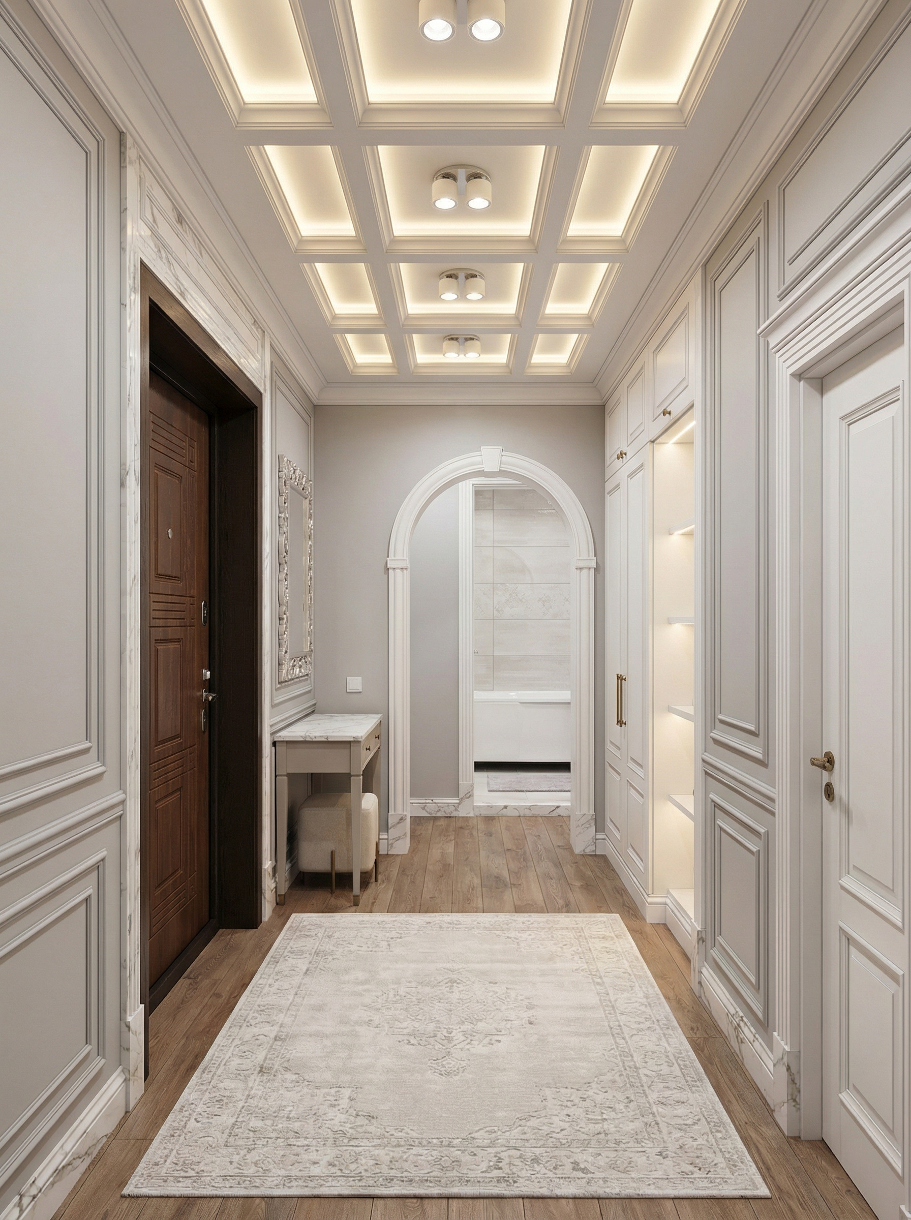 Утончённый стиль с симметрией, лепниной и благородными материалами. Классический интерьер сочетает роскошь и сдержанность, создавая атмосферу вневременной элегантности.