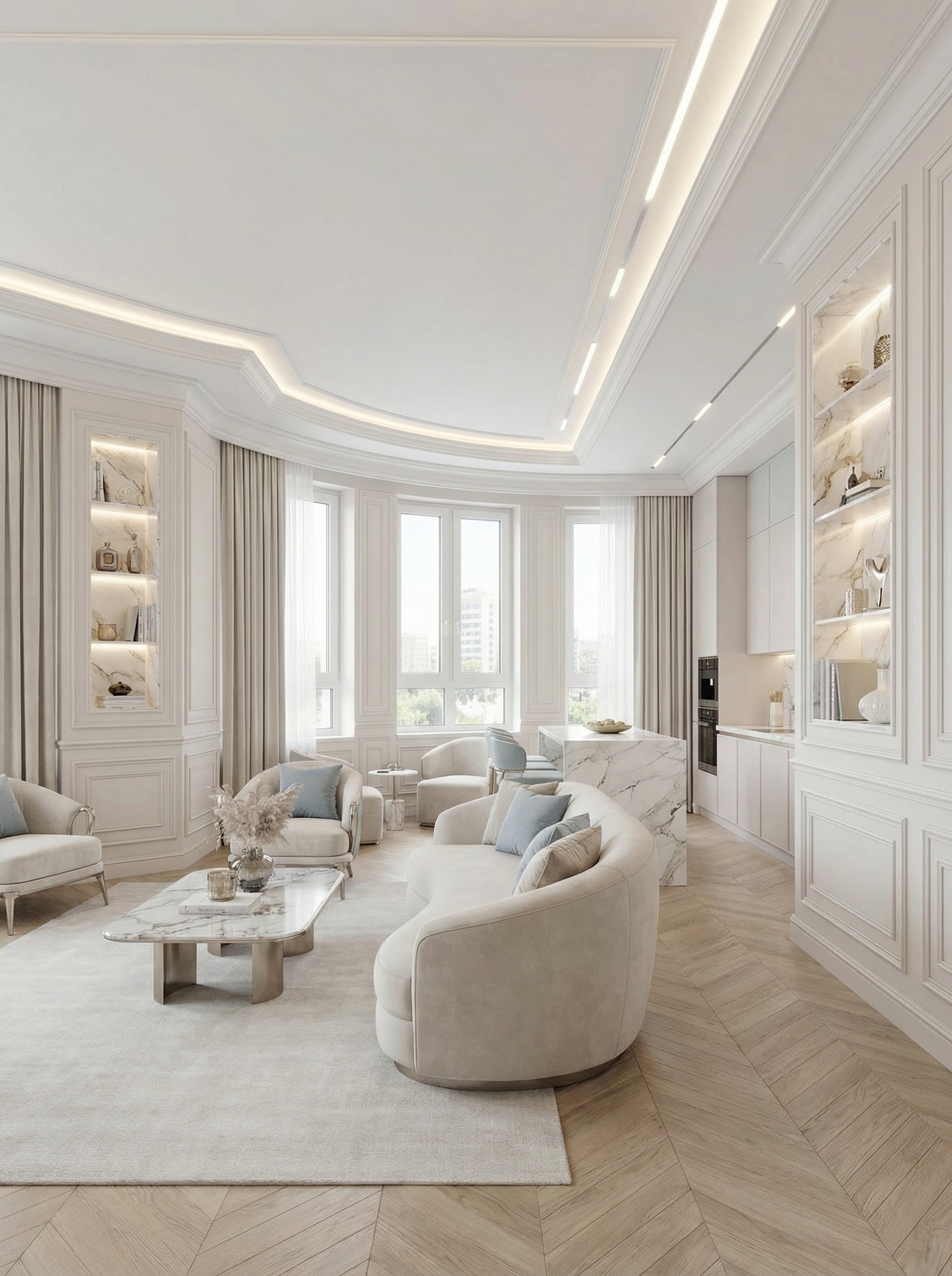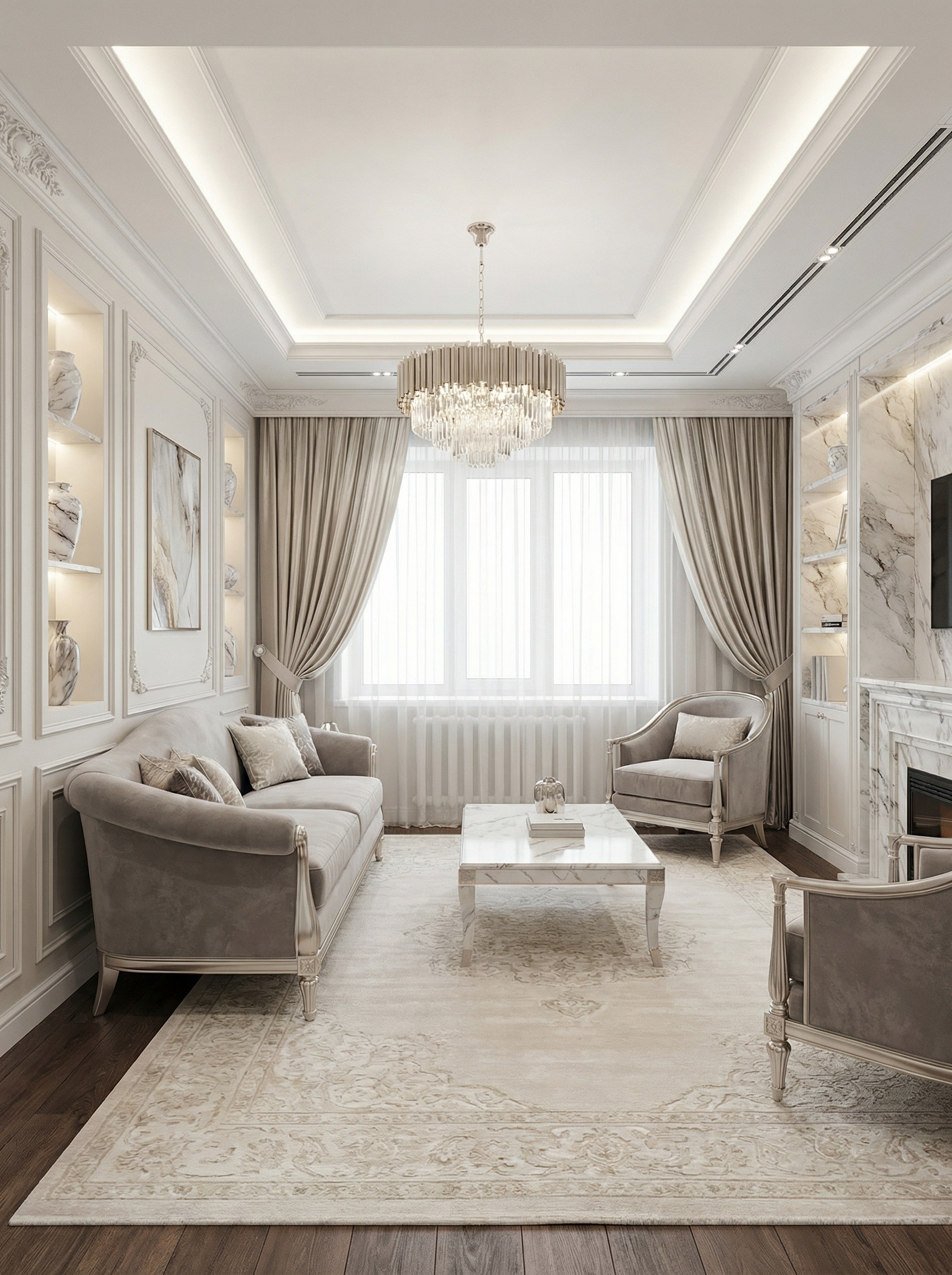 Утончённый стиль с симметрией, лепниной и благородными материалами. Классический интерьер сочетает роскошь и сдержанность, создавая атмосферу вневременной элегантности.