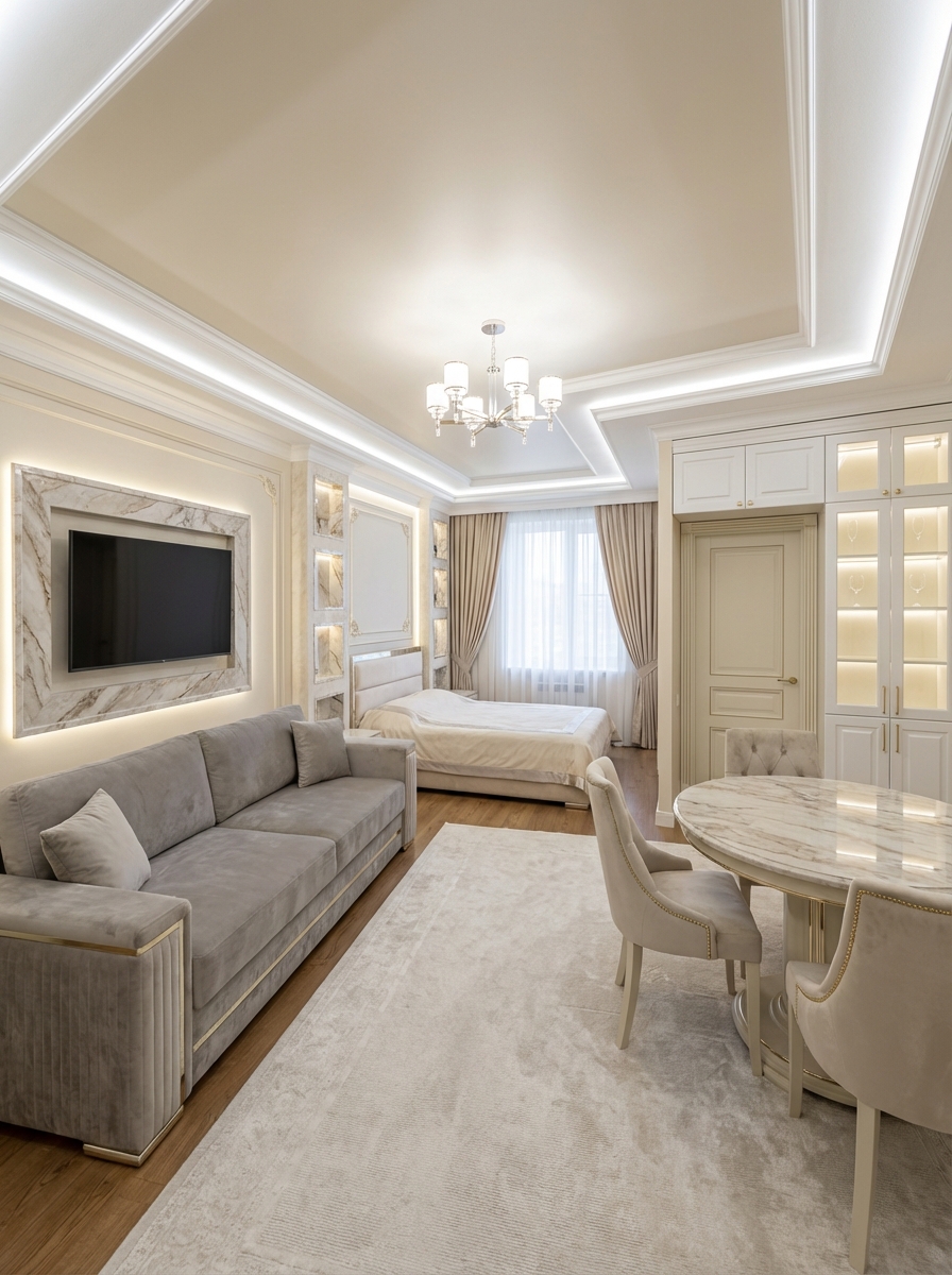 Утончённый стиль с симметрией, лепниной и благородными материалами. Классический интерьер сочетает роскошь и сдержанность, создавая атмосферу вневременной элегантности.