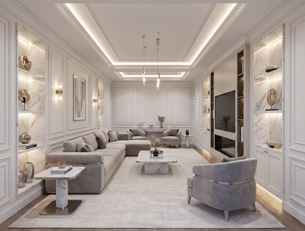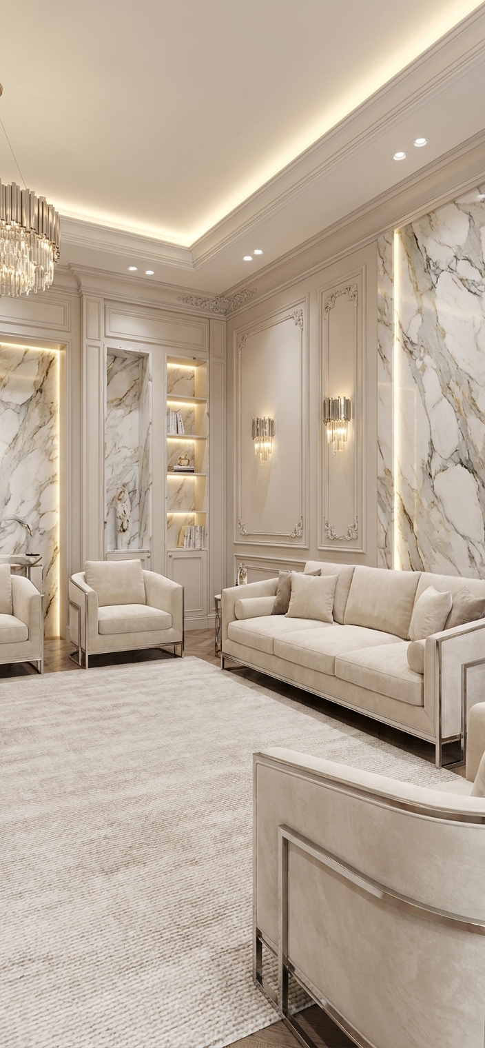 Утончённый стиль с симметрией, лепниной и благородными материалами. Классический интерьер сочетает роскошь и сдержанность, создавая атмосферу вневременной элегантности.