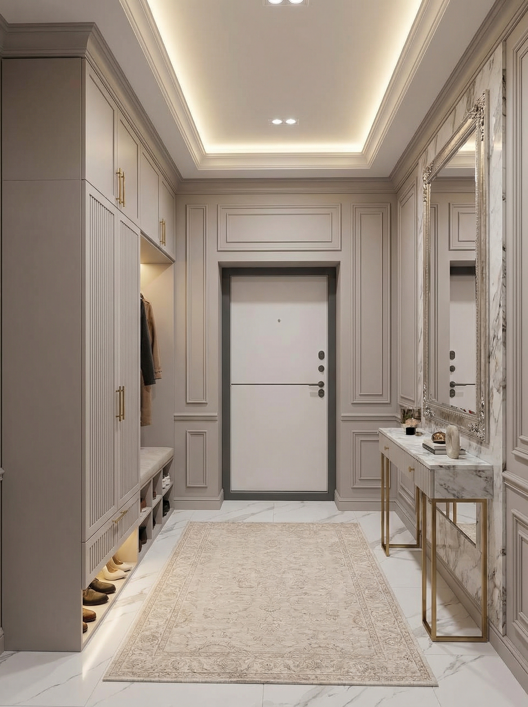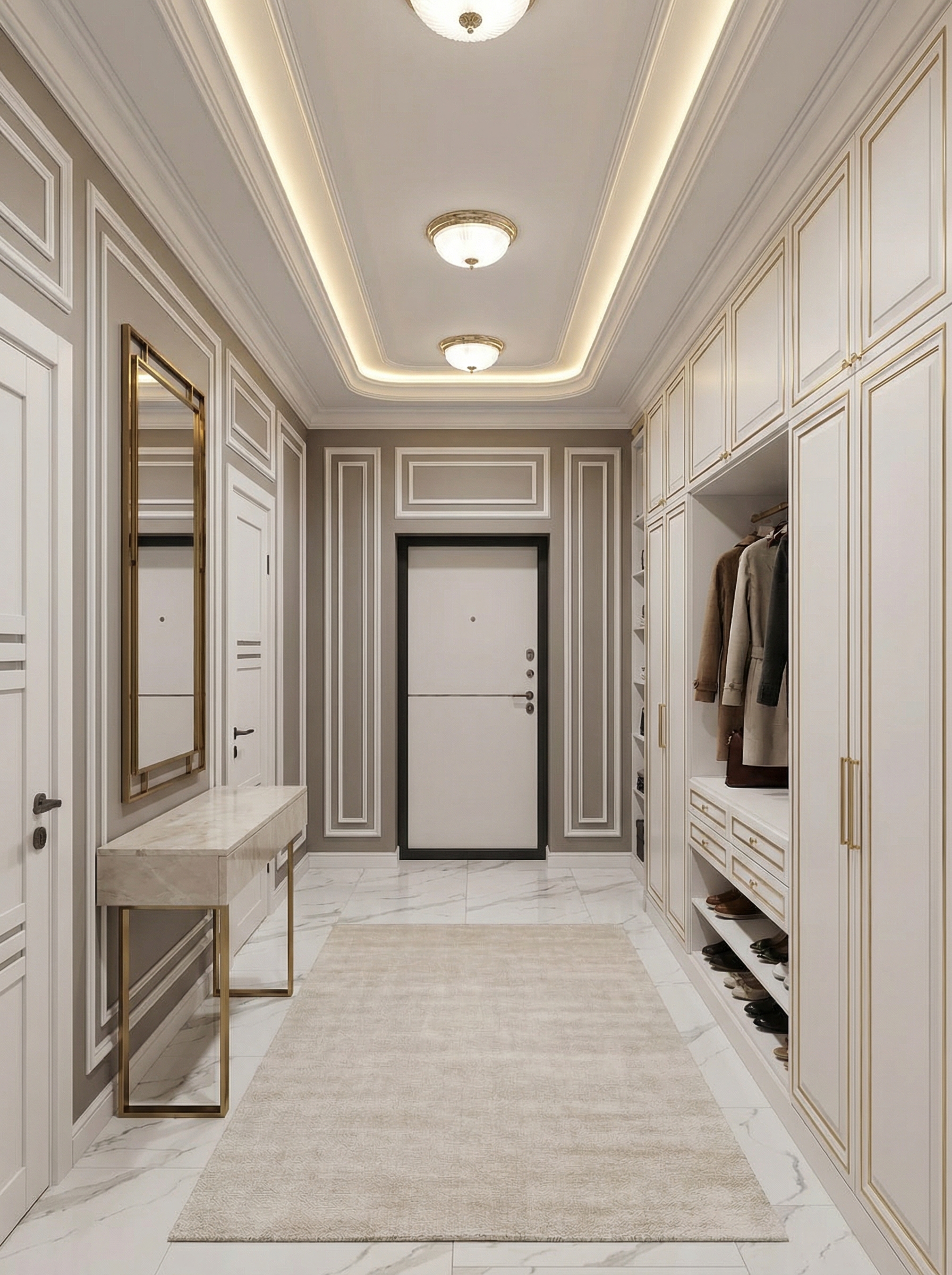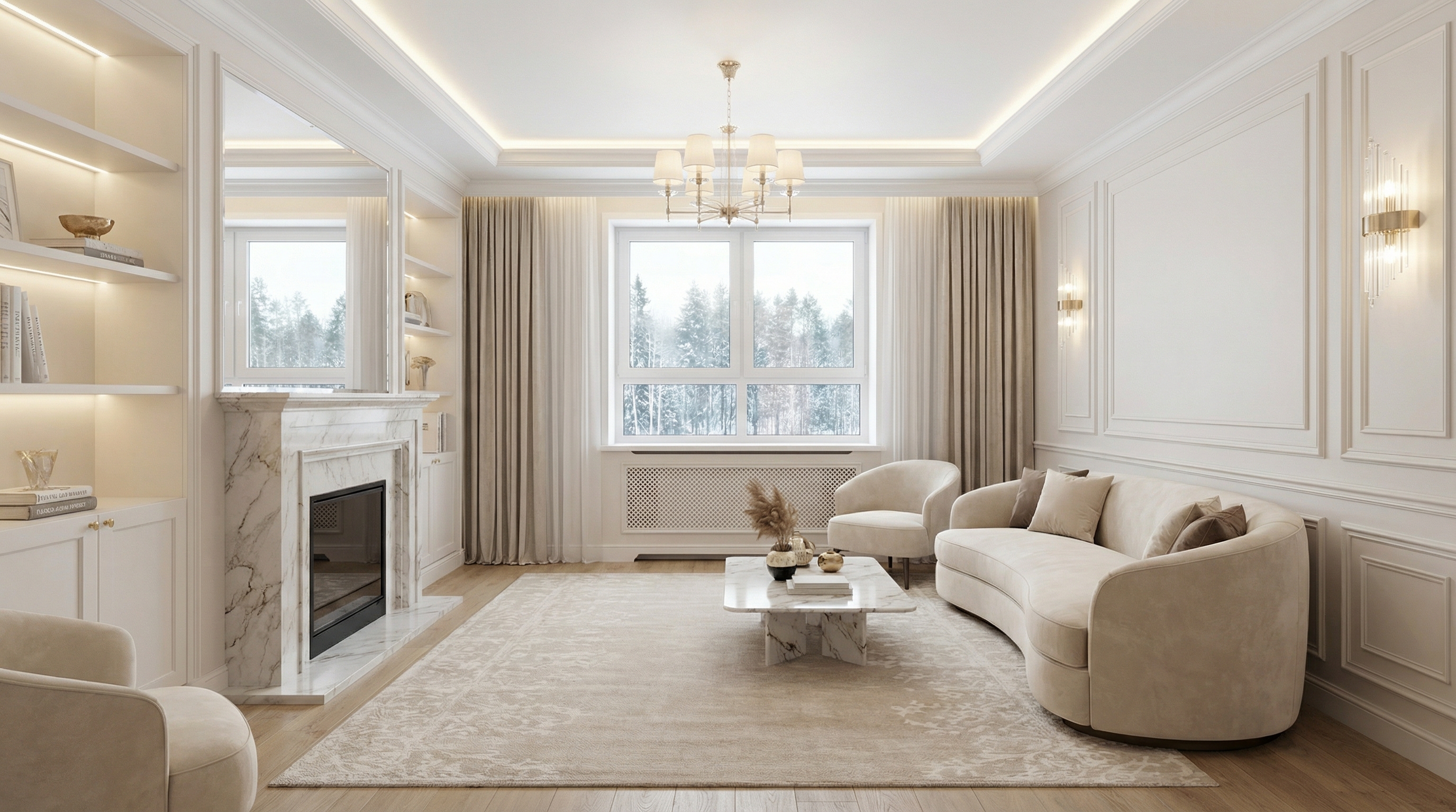 Утончённый стиль с симметрией, лепниной и благородными материалами. Классический интерьер сочетает роскошь и сдержанность, создавая атмосферу вневременной элегантности.