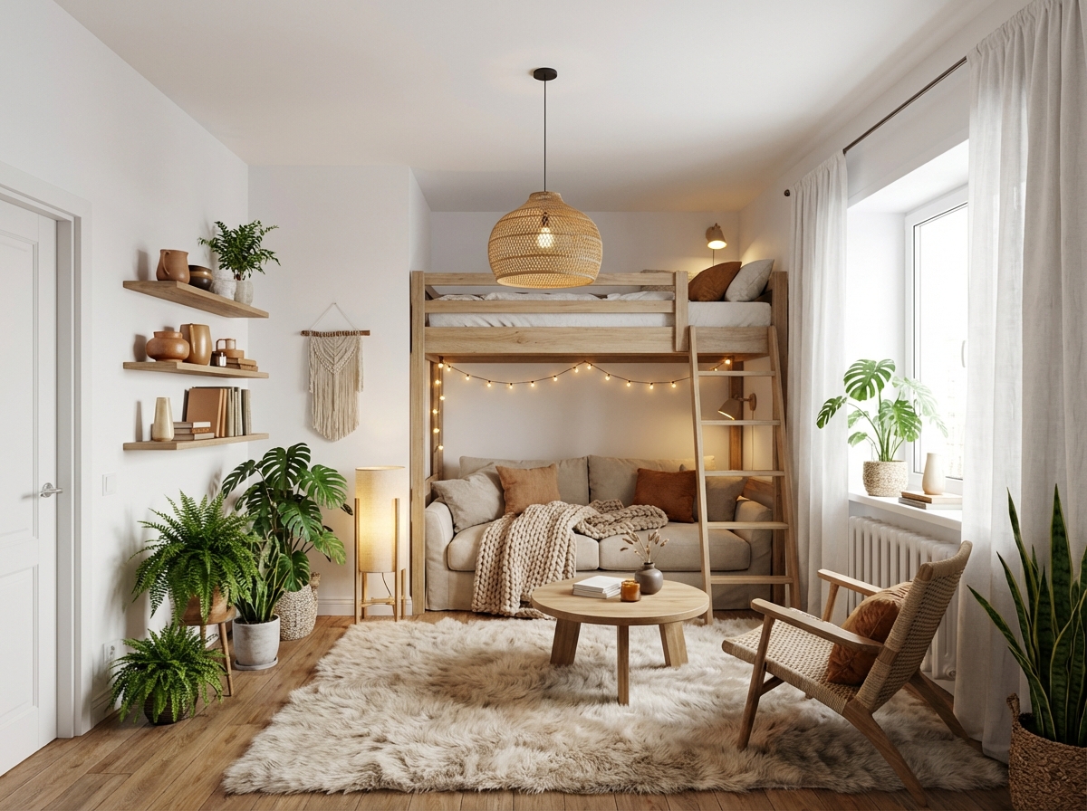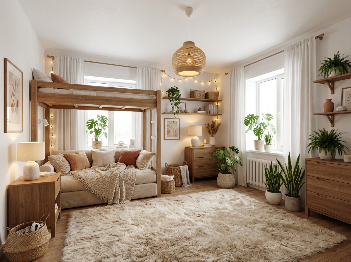 Уютный скандинавский стиль с акцентом на комфорт и тёплую атмосферу. Натуральные материалы, мягкие текстуры и приглушённые тона создают ощущение домашнего тепла и спокойствия.