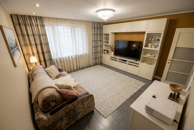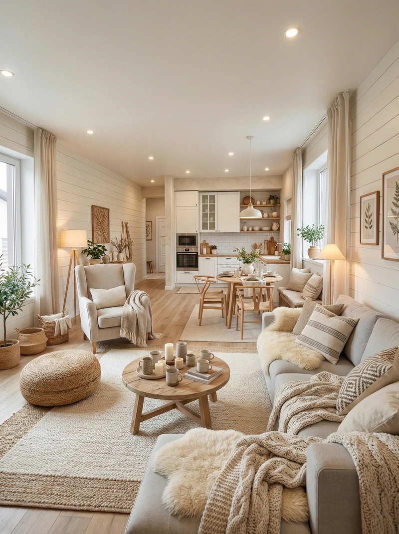 Уютный скандинавский стиль с акцентом на комфорт и тёплую атмосферу. Натуральные материалы, мягкие текстуры и приглушённые тона создают ощущение домашнего тепла и спокойствия.