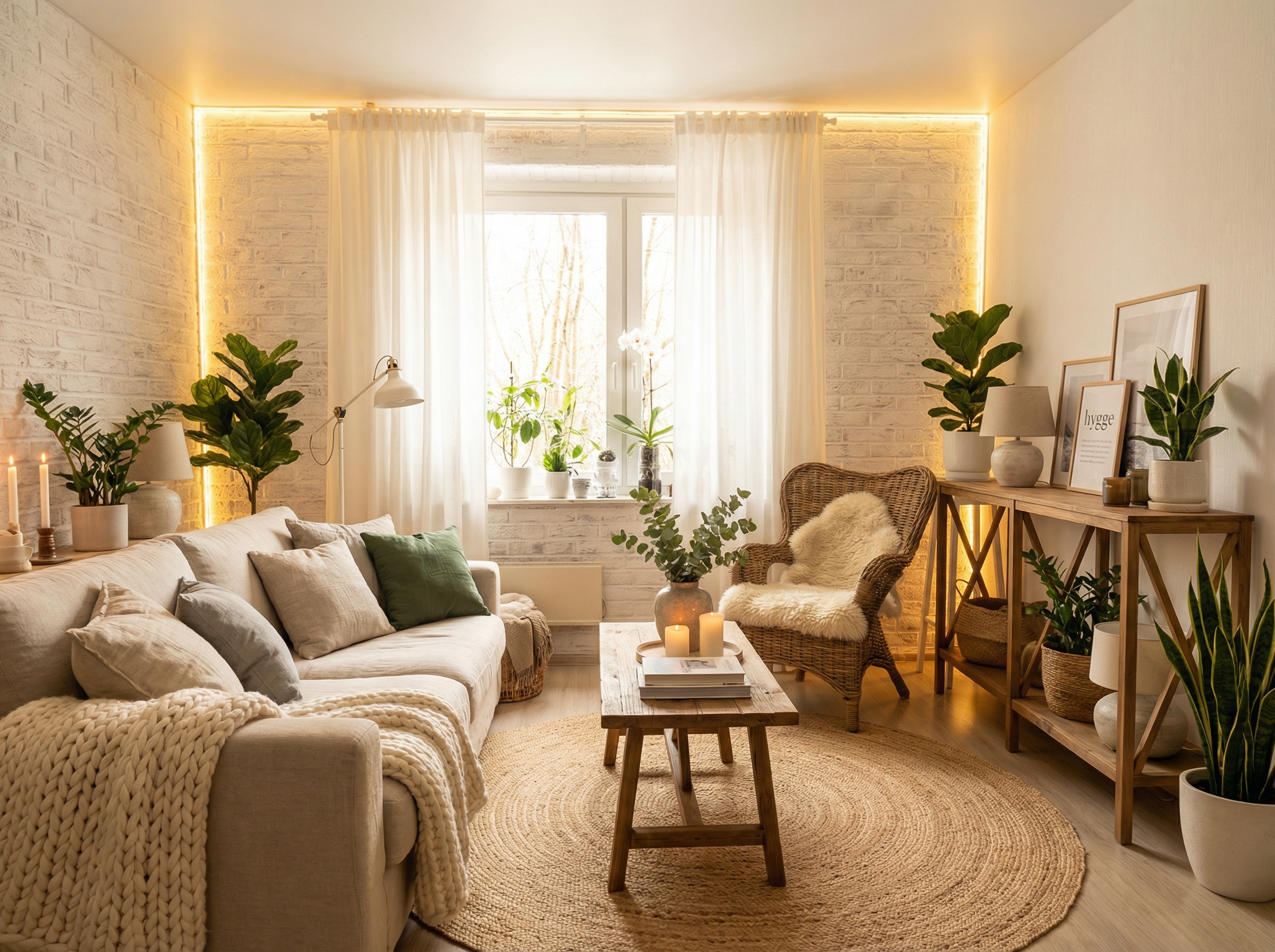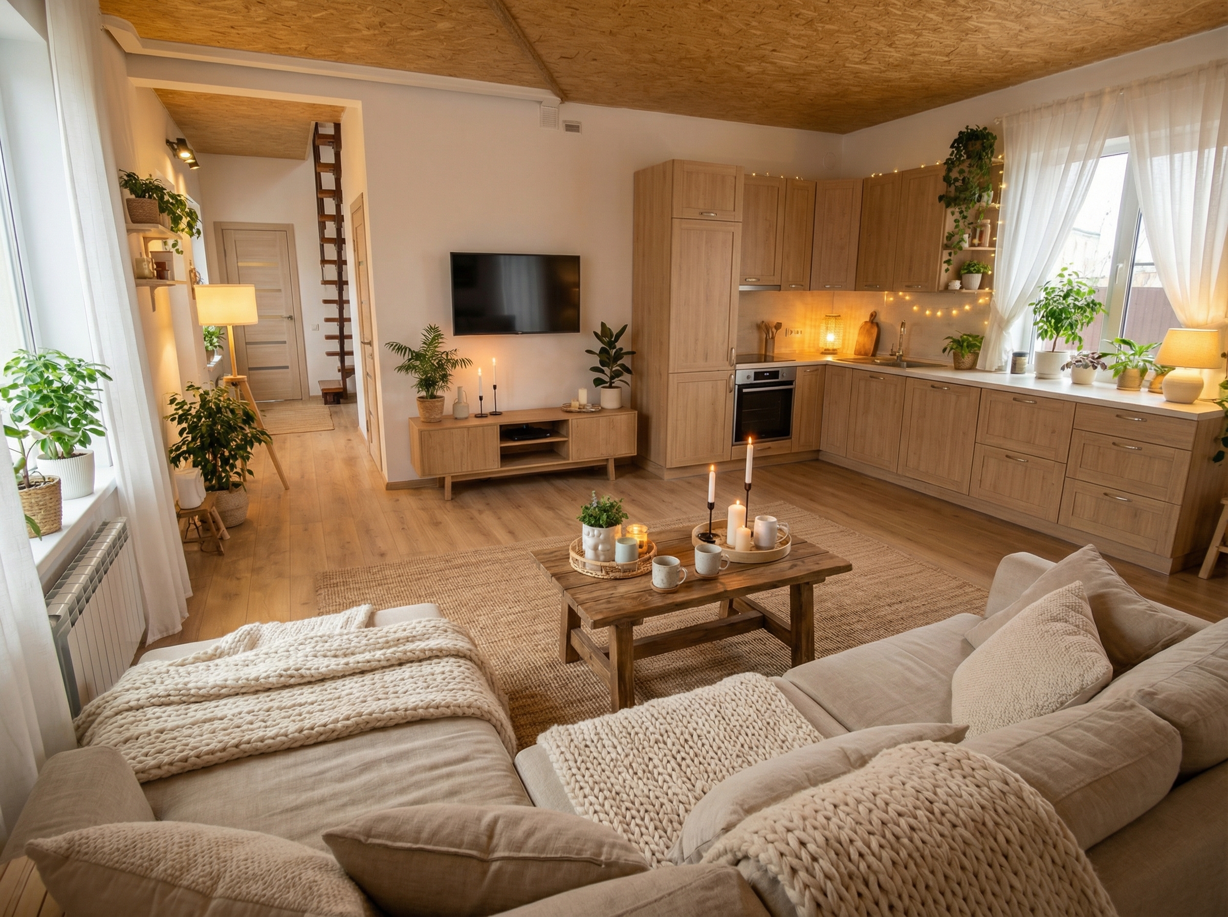 Уютный скандинавский стиль с акцентом на комфорт и тёплую атмосферу. Натуральные материалы, мягкие текстуры и приглушённые тона создают ощущение домашнего тепла и спокойствия.