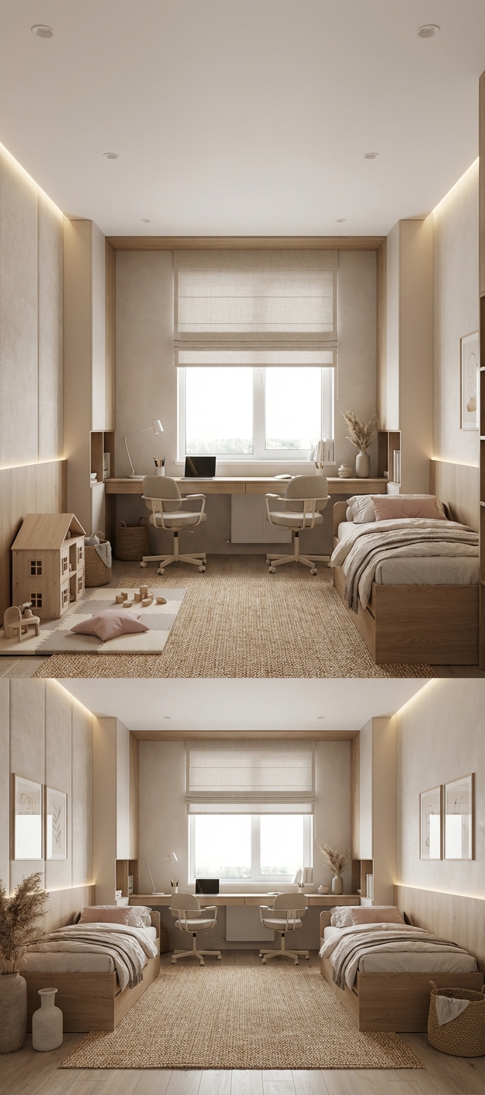 В этой подборке 46 примеров оформления детской в стиле Japandi, созданных нейросетью RoomGPT. Каждое изображение сгенерировано на основе реального фото помещения.