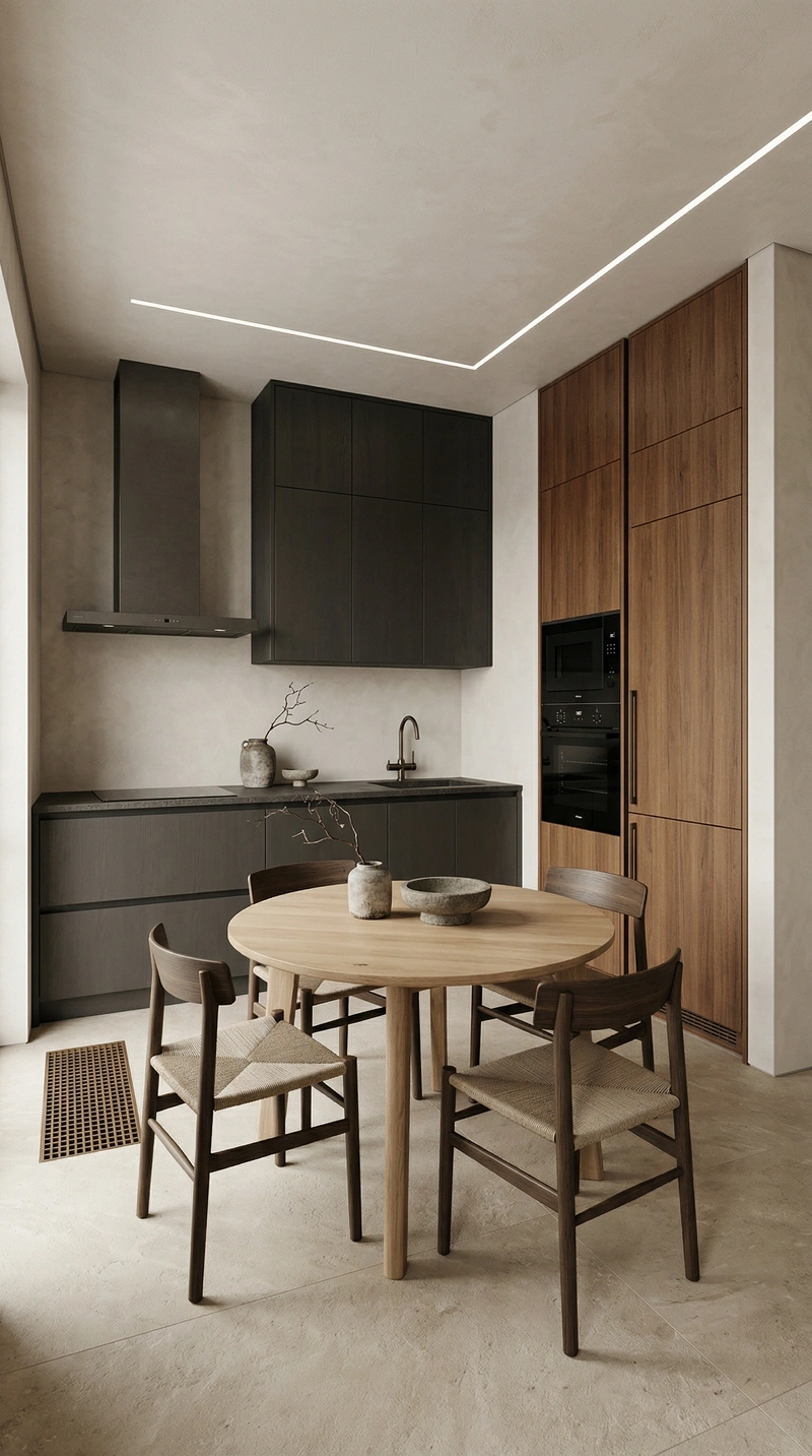 Гармоничное сочетание японской эстетики и скандинавской функциональности. Натуральное дерево, нейтральные тона и осознанный подход к каждому элементу интерьера.