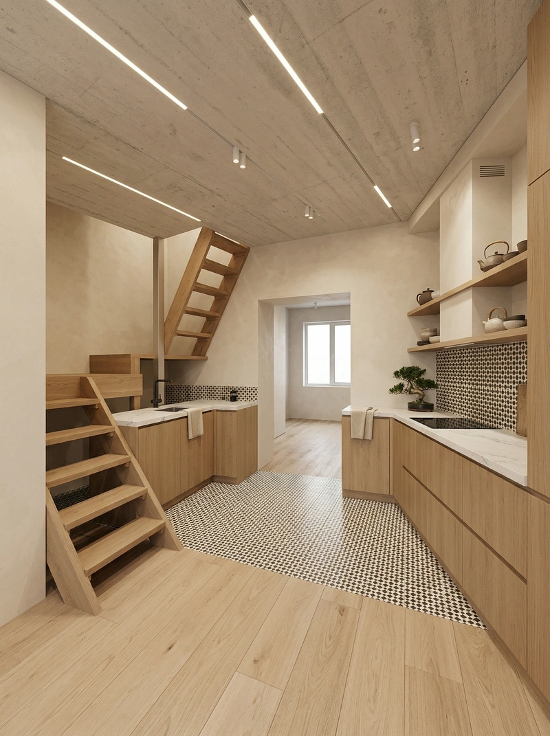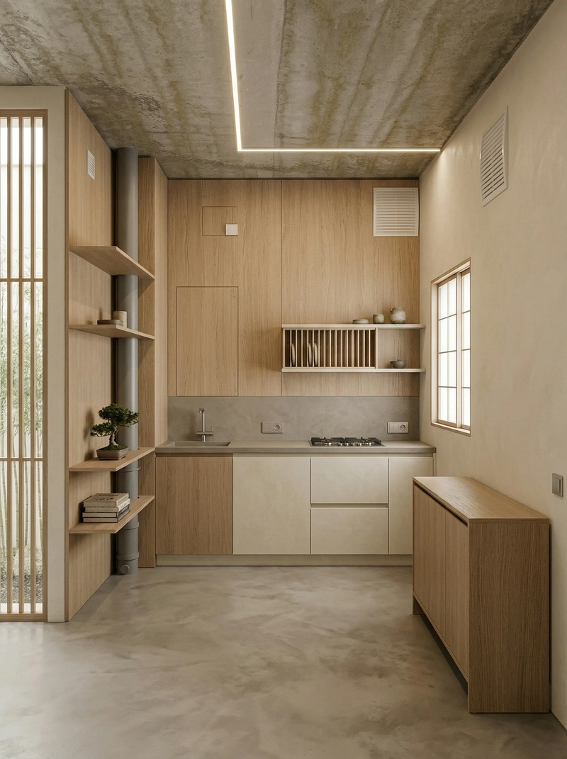 Гармоничное сочетание японской эстетики и скандинавской функциональности. Натуральное дерево, нейтральные тона и осознанный подход к каждому элементу интерьера.