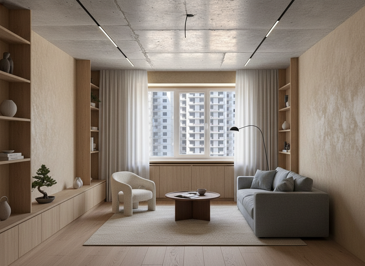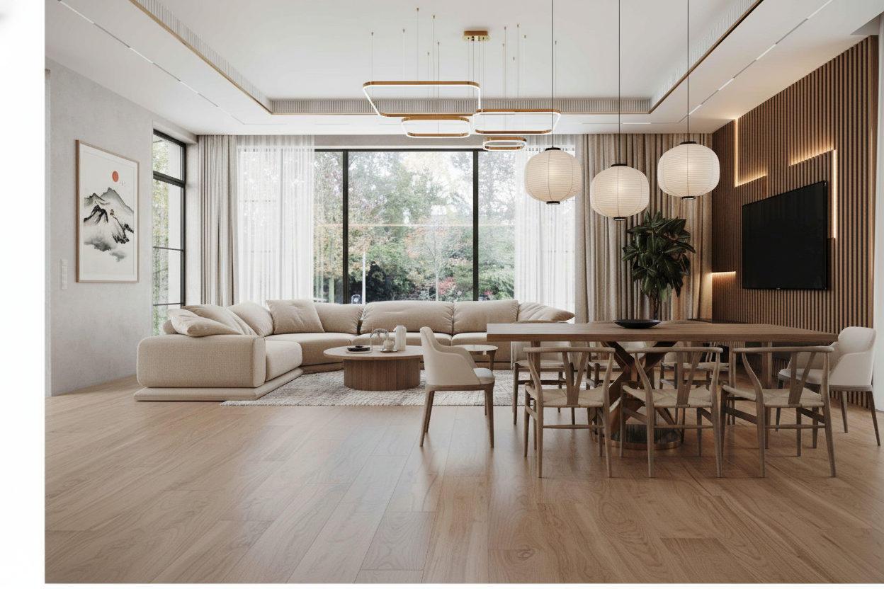 Гармоничное сочетание японской эстетики и скандинавской функциональности. Натуральное дерево, нейтральные тона и осознанный подход к каждому элементу интерьера.