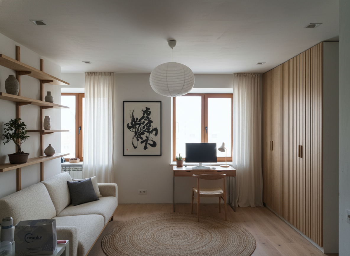 Гармоничное сочетание японской эстетики и скандинавской функциональности. Натуральное дерево, нейтральные тона и осознанный подход к каждому элементу интерьера.