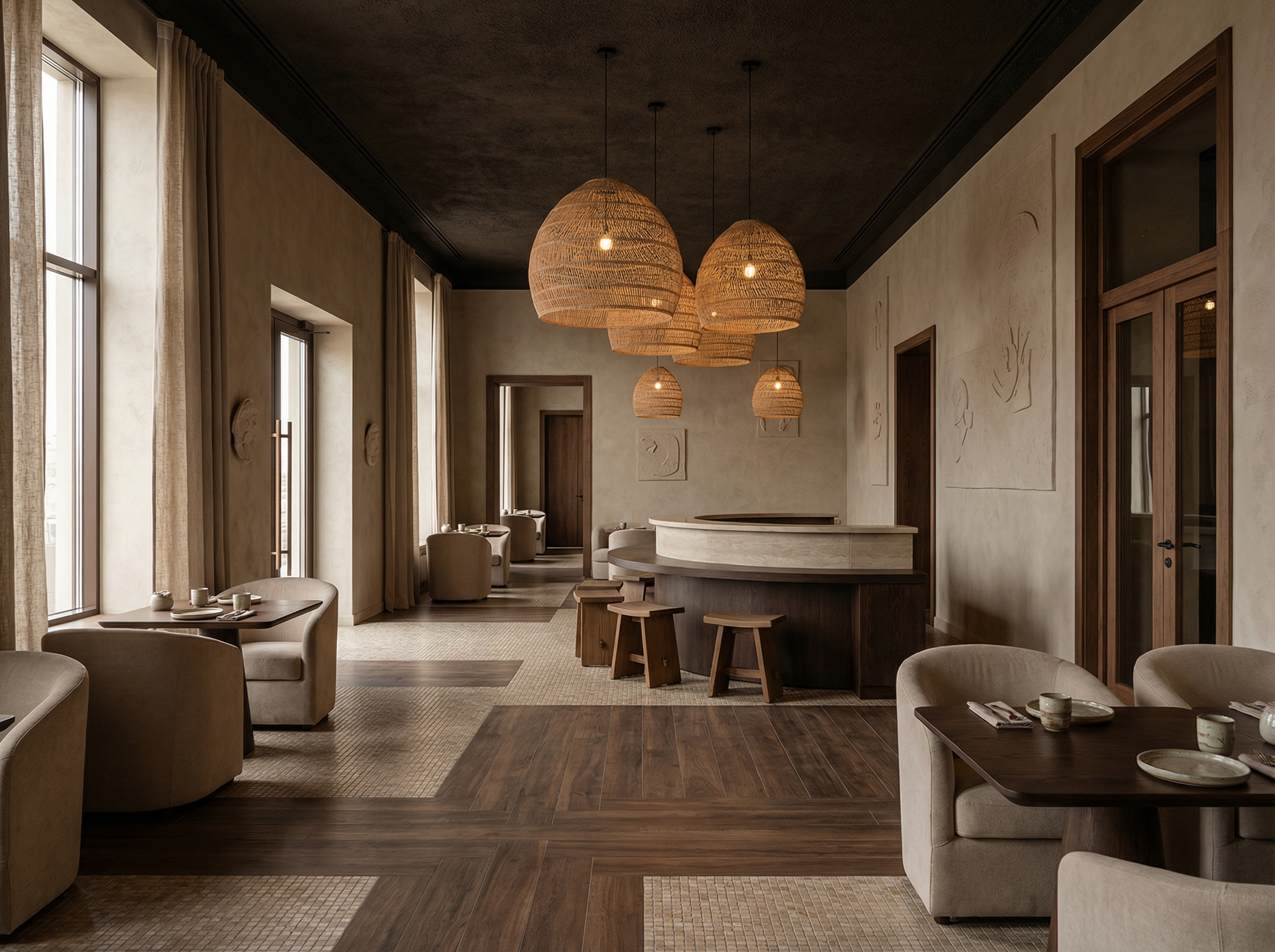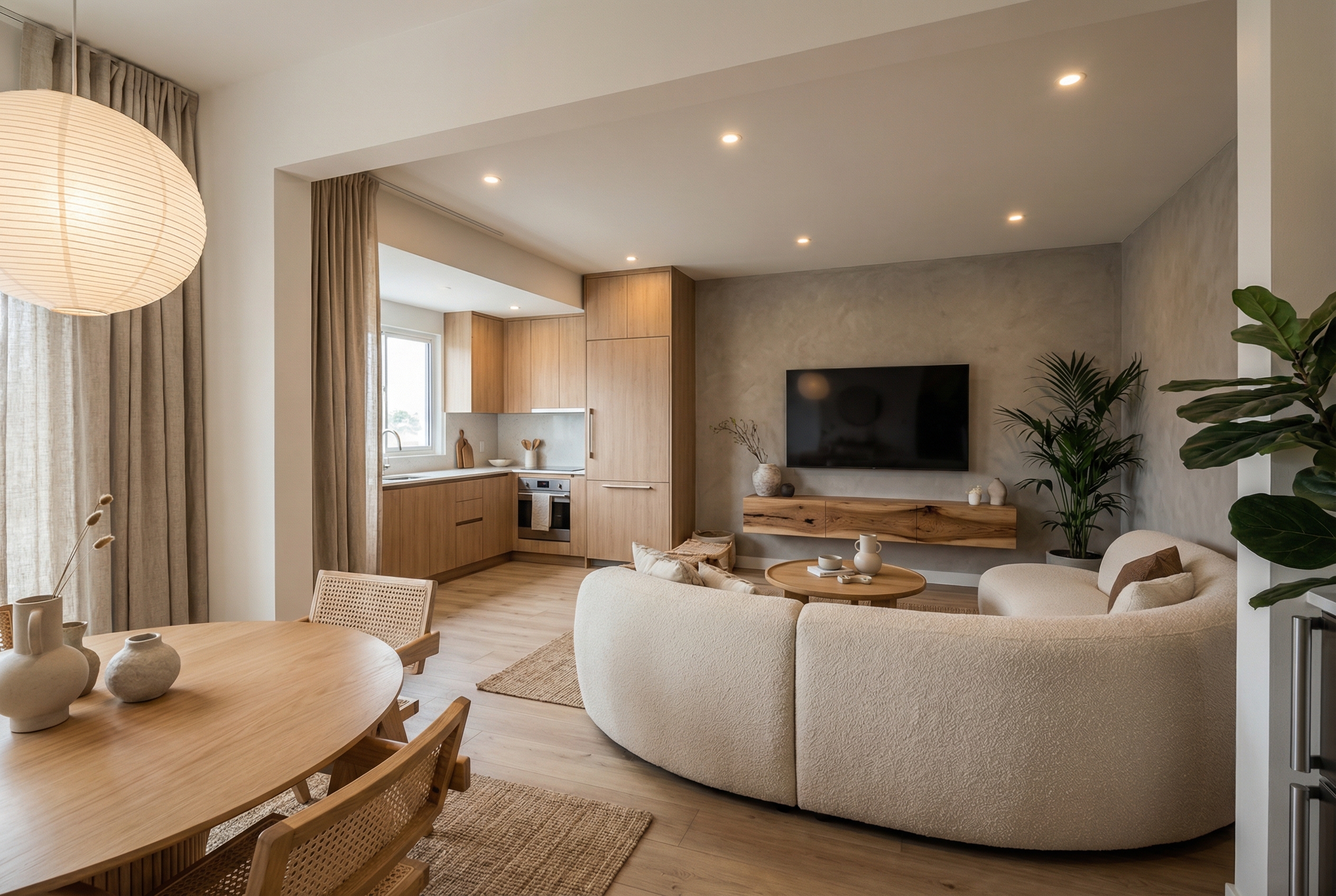 Гармоничное сочетание японской эстетики и скандинавской функциональности. Натуральное дерево, нейтральные тона и осознанный подход к каждому элементу интерьера.