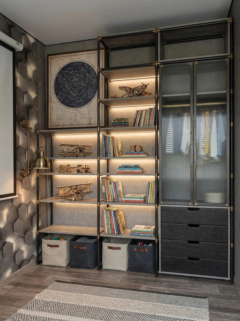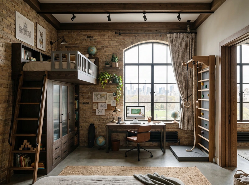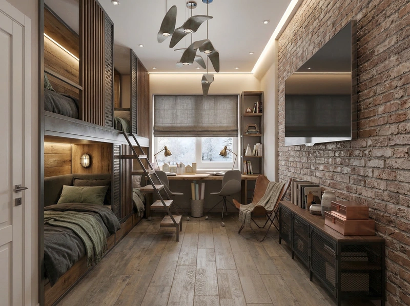 Индустриальный стиль с кирпичными стенами, открытыми коммуникациями и металлическими элементами. Лофт создаёт атмосферу творческого пространства с характером.