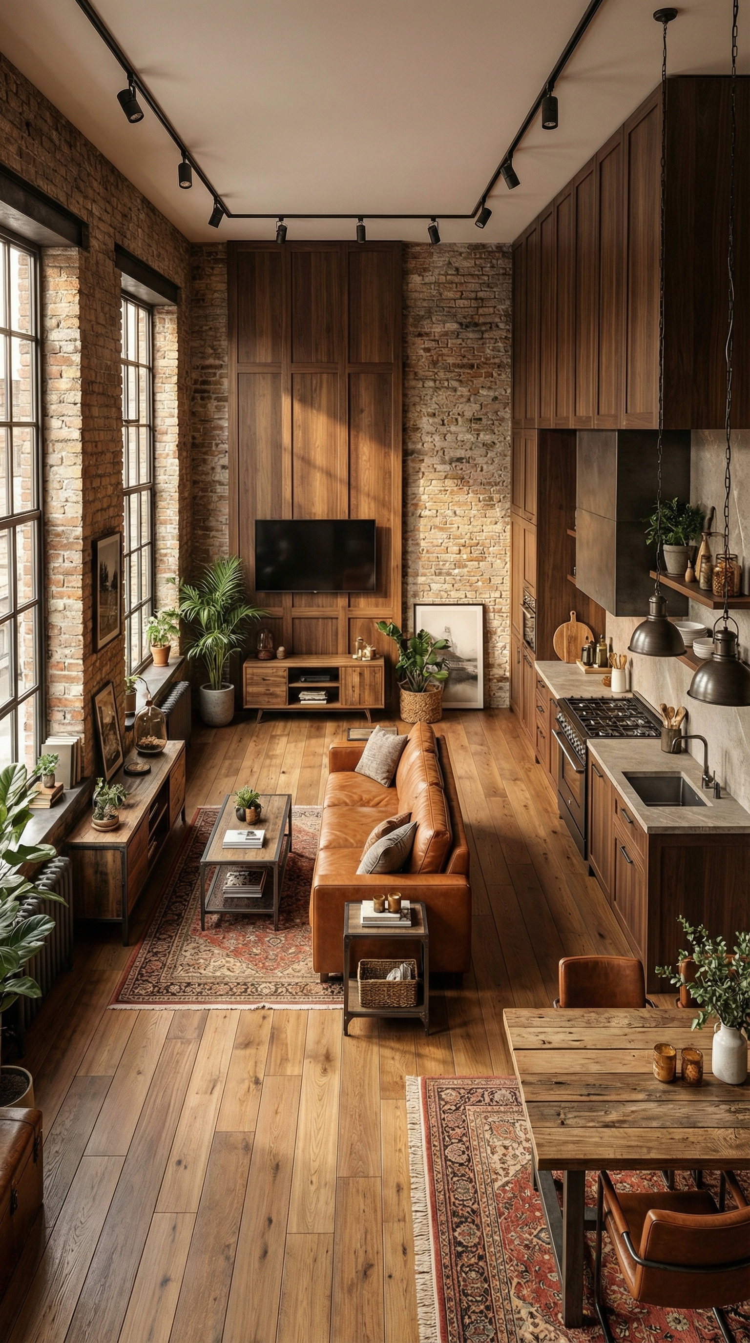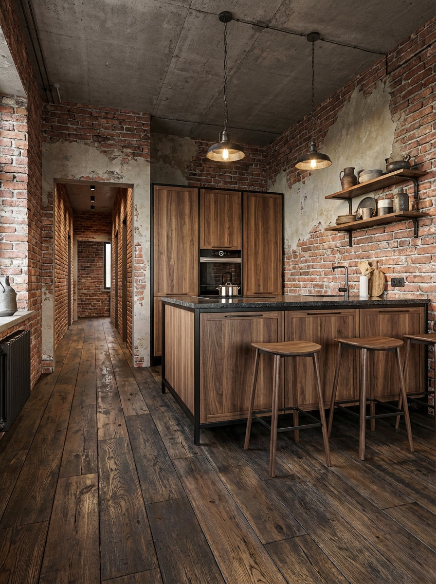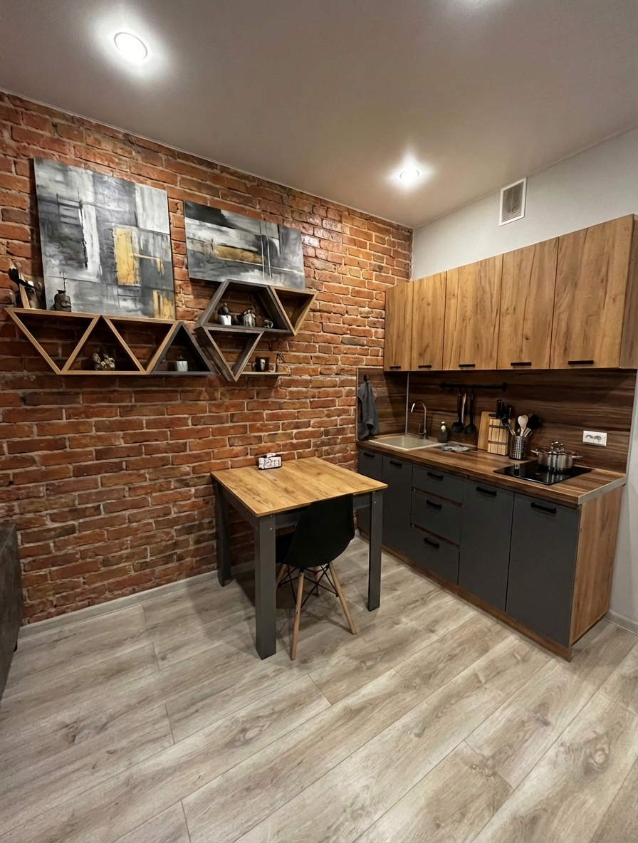 Индустриальный стиль с кирпичными стенами, открытыми коммуникациями и металлическими элементами. Лофт создаёт атмосферу творческого пространства с характером.