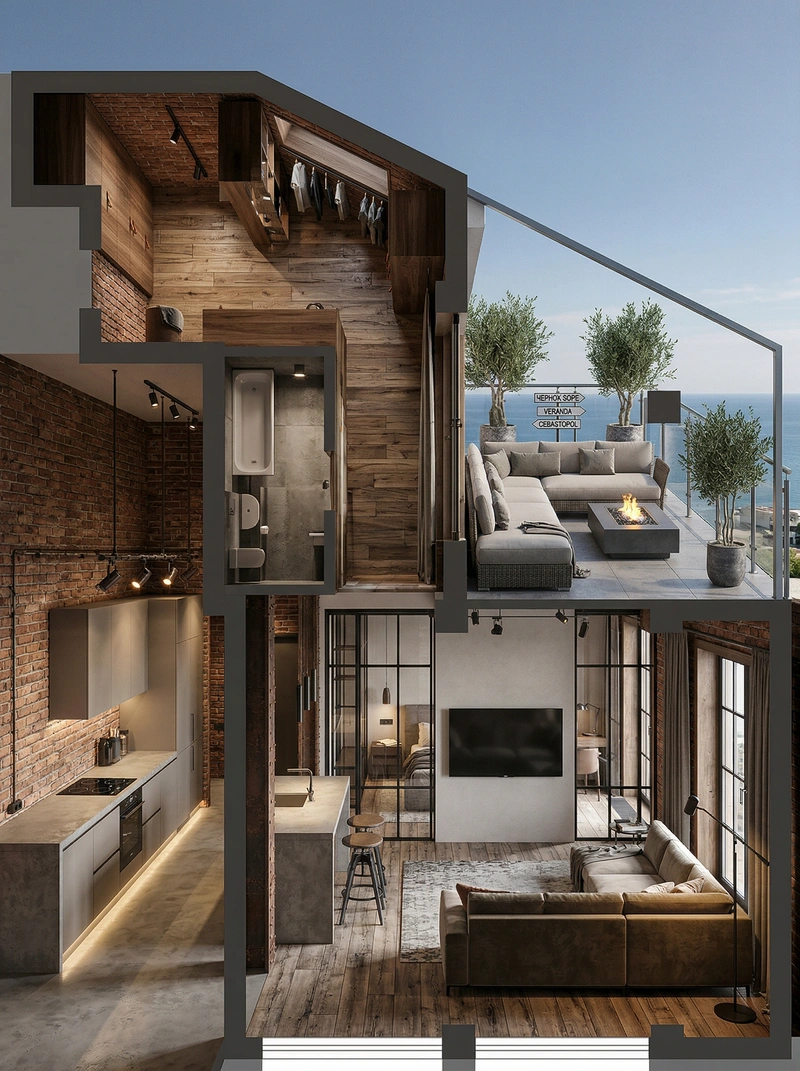 Индустриальный стиль с кирпичными стенами, открытыми коммуникациями и металлическими элементами. Лофт создаёт атмосферу творческого пространства с характером.