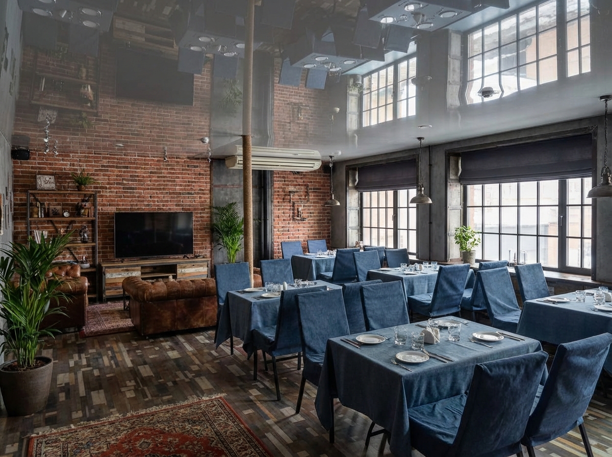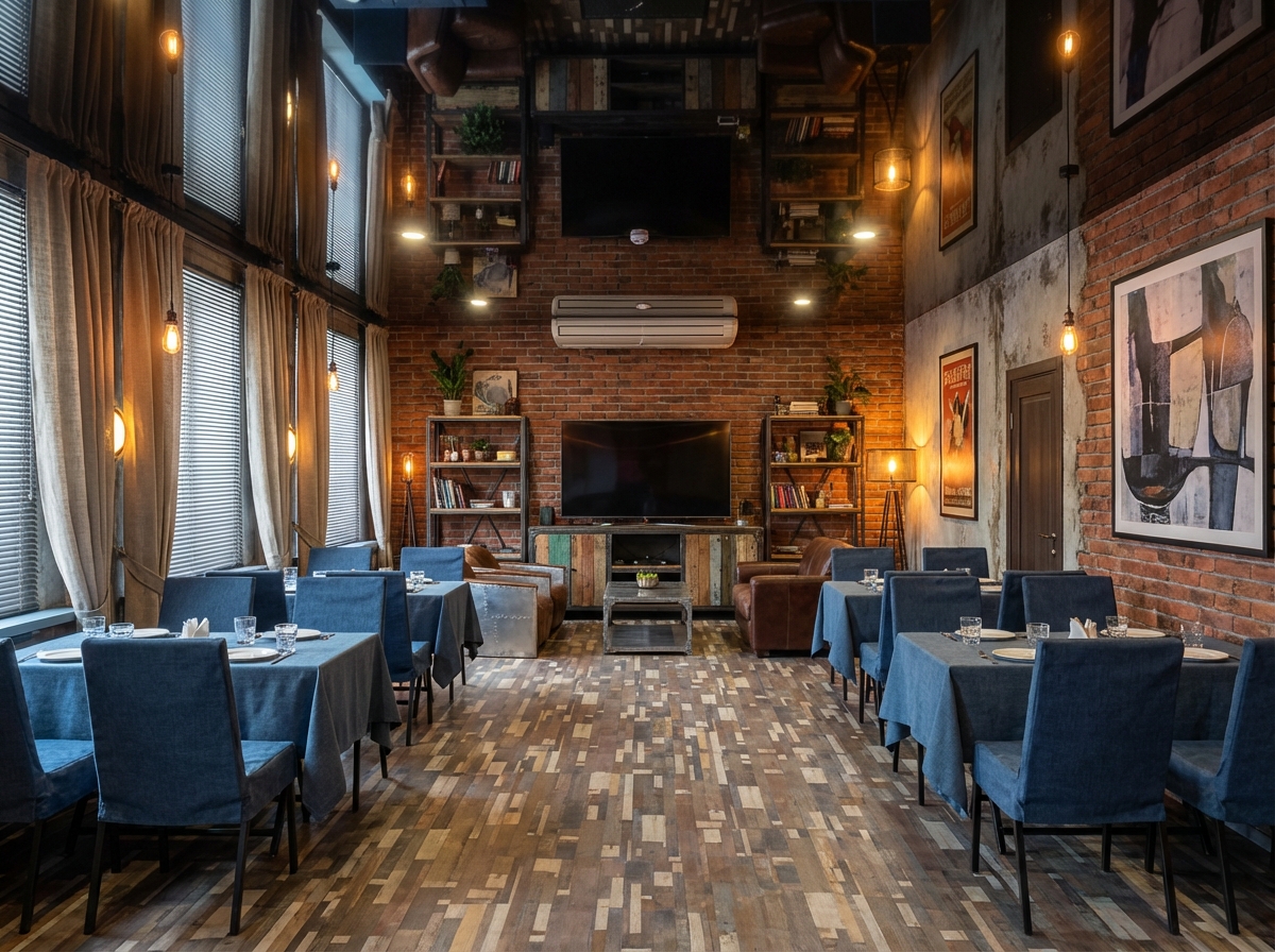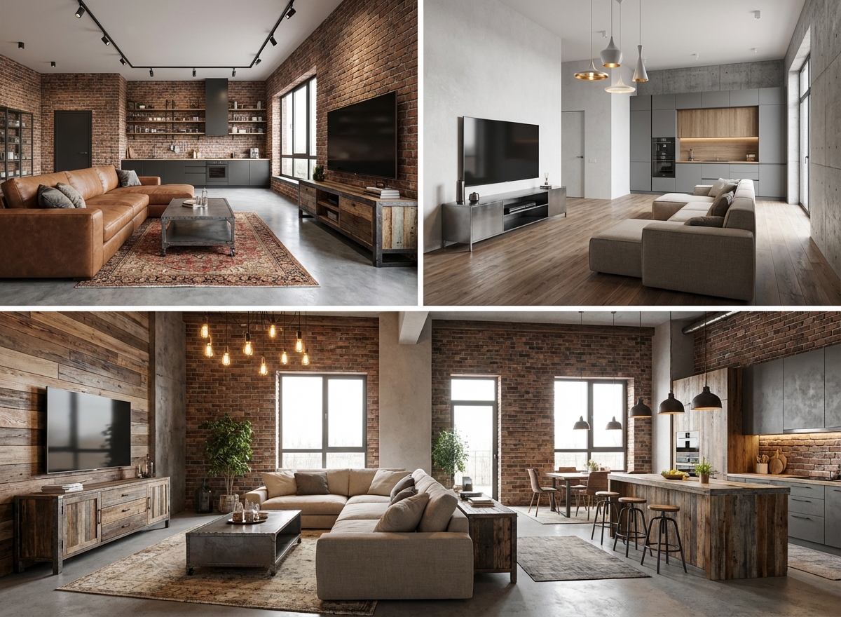 Индустриальный стиль с кирпичными стенами, открытыми коммуникациями и металлическими элементами. Лофт создаёт атмосферу творческого пространства с характером.
