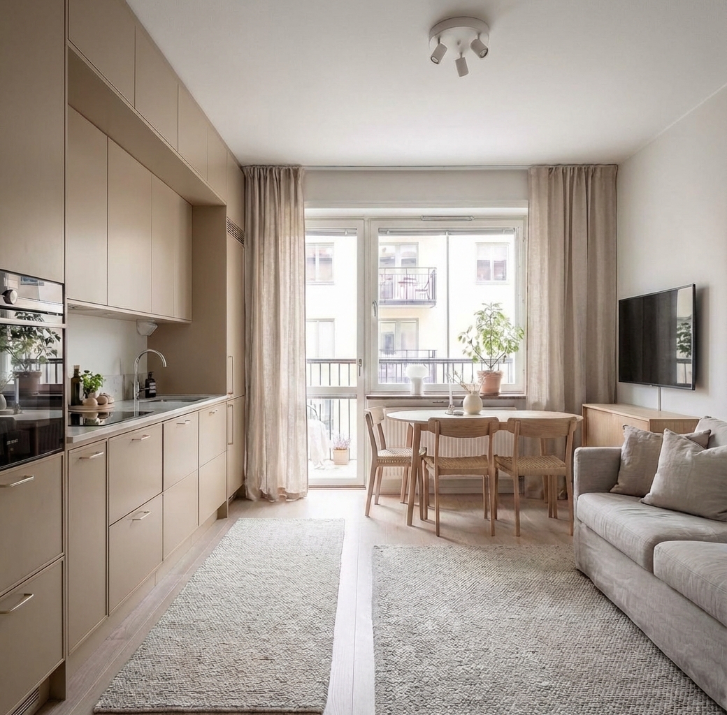 Светлый и воздушный скандинавский стиль. Белые стены, деревянные полы, функциональная мебель и яркие акценты создают лёгкое и практичное пространство.