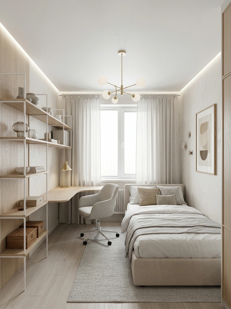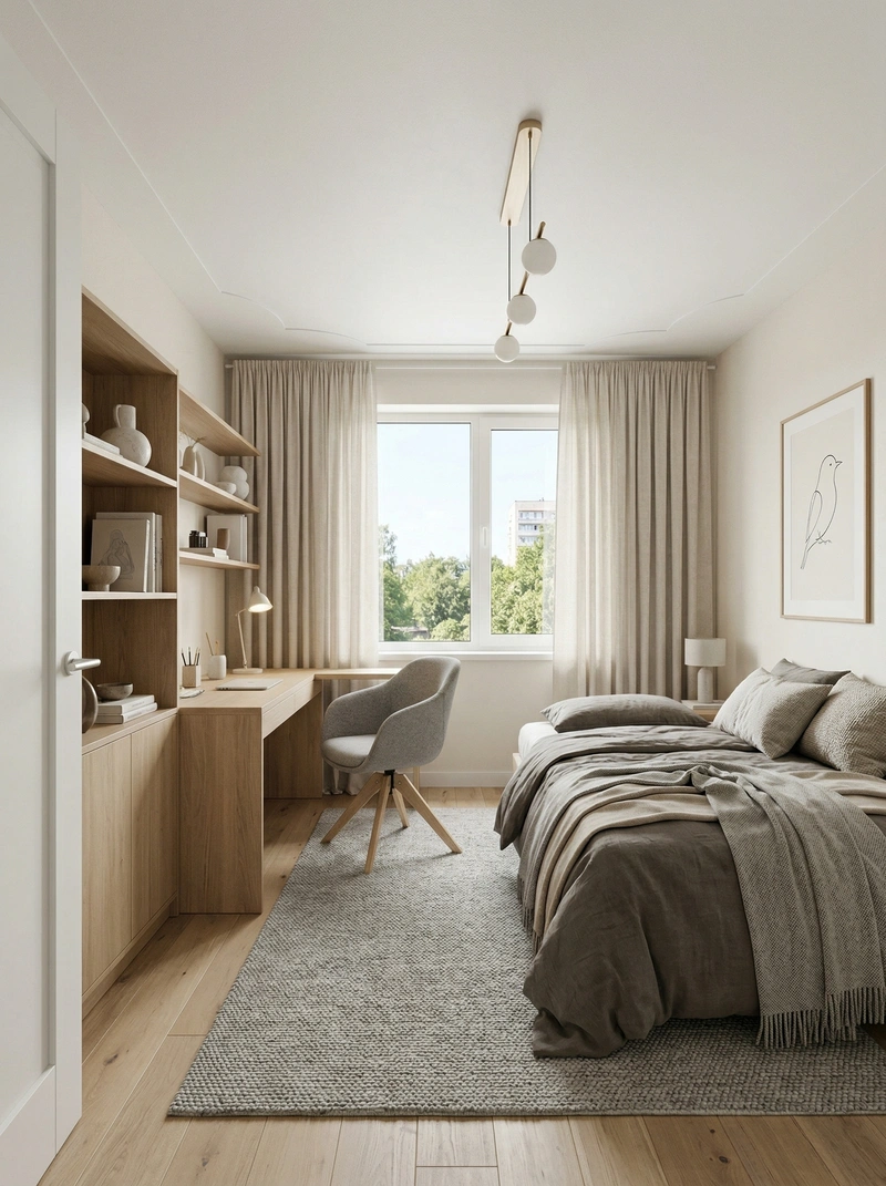 Светлый и воздушный скандинавский стиль. Белые стены, деревянные полы, функциональная мебель и яркие акценты создают лёгкое и практичное пространство.