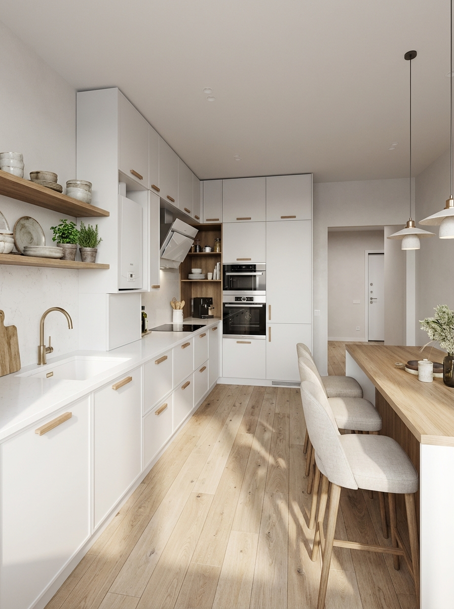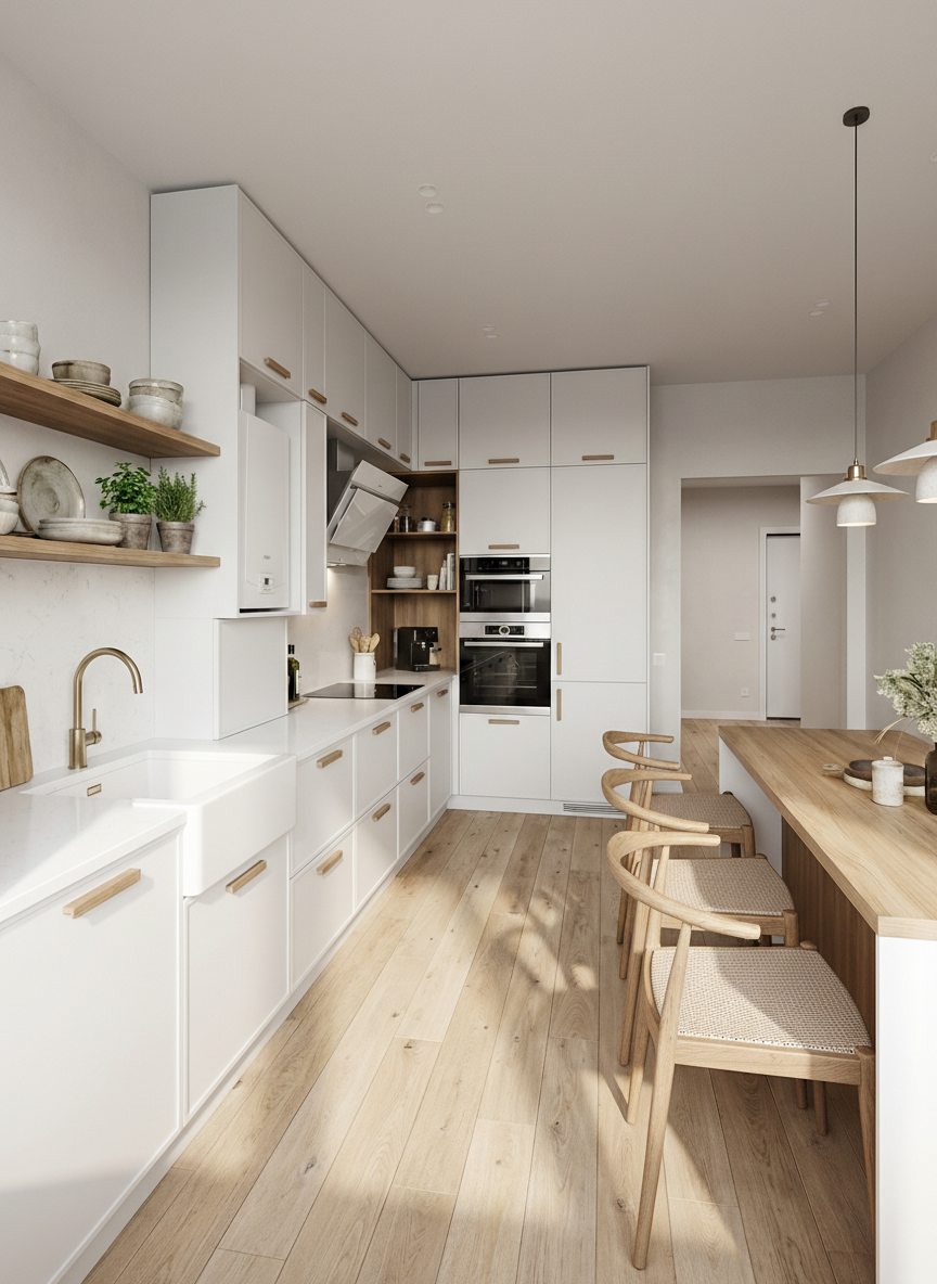 Светлый и воздушный скандинавский стиль. Белые стены, деревянные полы, функциональная мебель и яркие акценты создают лёгкое и практичное пространство.