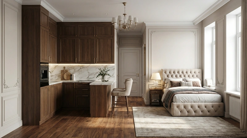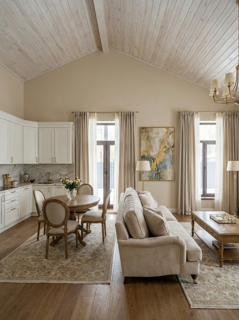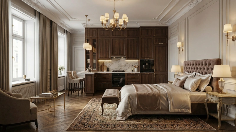 Утончённый стиль с симметрией, лепниной и благородными материалами. Классический интерьер сочетает роскошь и сдержанность, создавая атмосферу вневременной элегантности.