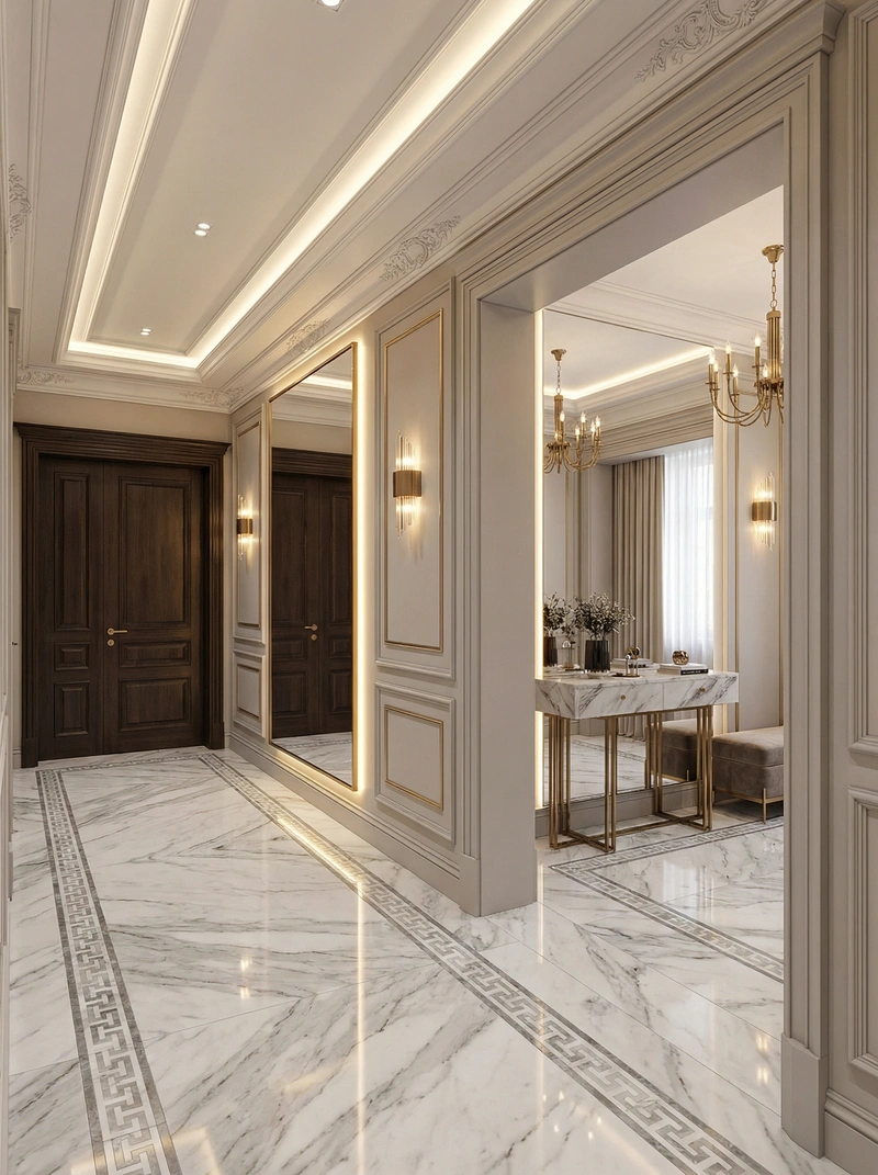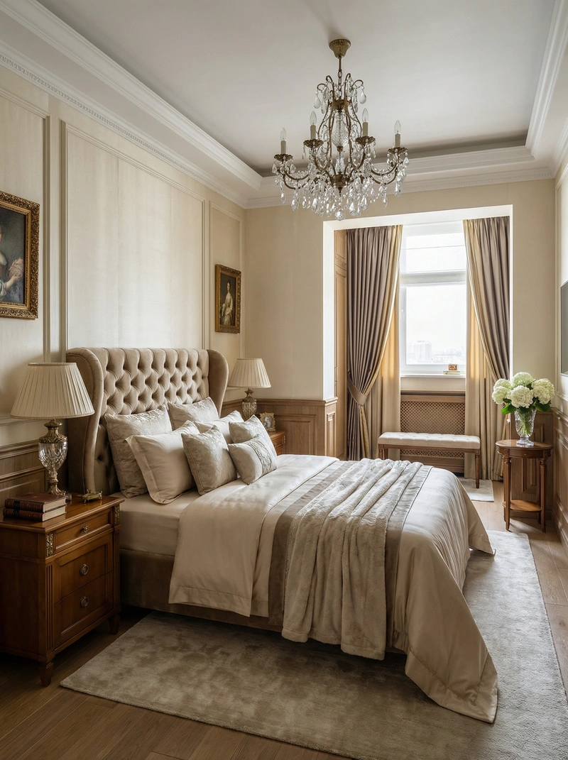Утончённый стиль с симметрией, лепниной и благородными материалами. Классический интерьер сочетает роскошь и сдержанность, создавая атмосферу вневременной элегантности.