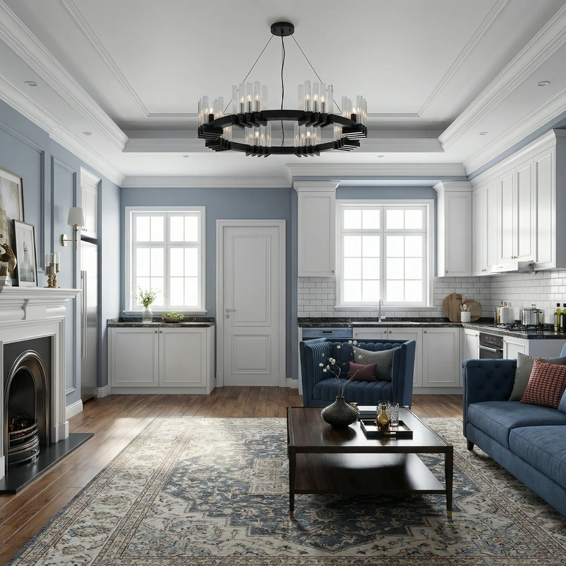 Утончённый стиль с симметрией, лепниной и благородными материалами. Классический интерьер сочетает роскошь и сдержанность, создавая атмосферу вневременной элегантности.