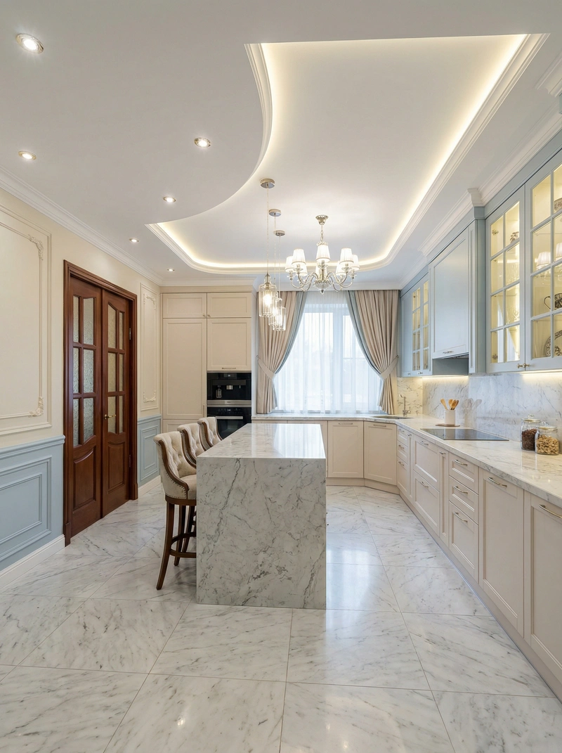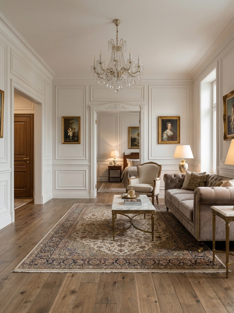 Утончённый стиль с симметрией, лепниной и благородными материалами. Классический интерьер сочетает роскошь и сдержанность, создавая атмосферу вневременной элегантности.