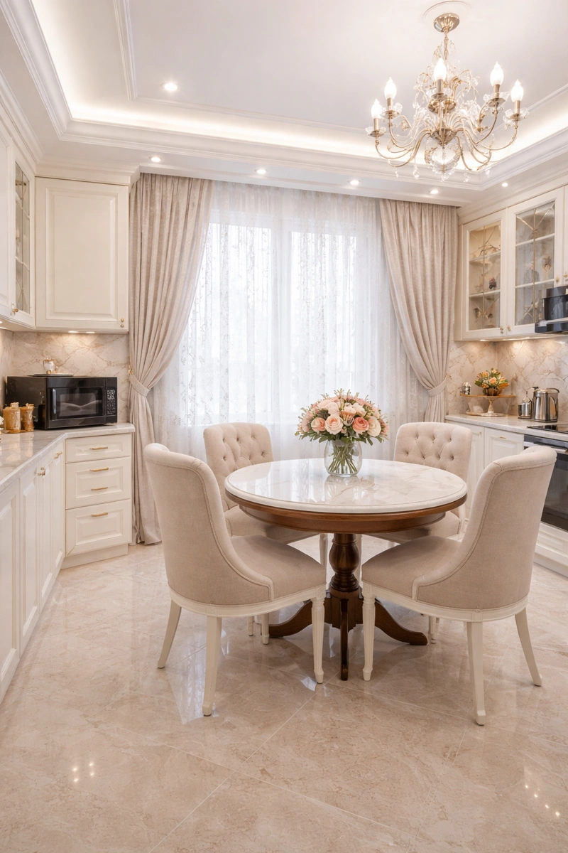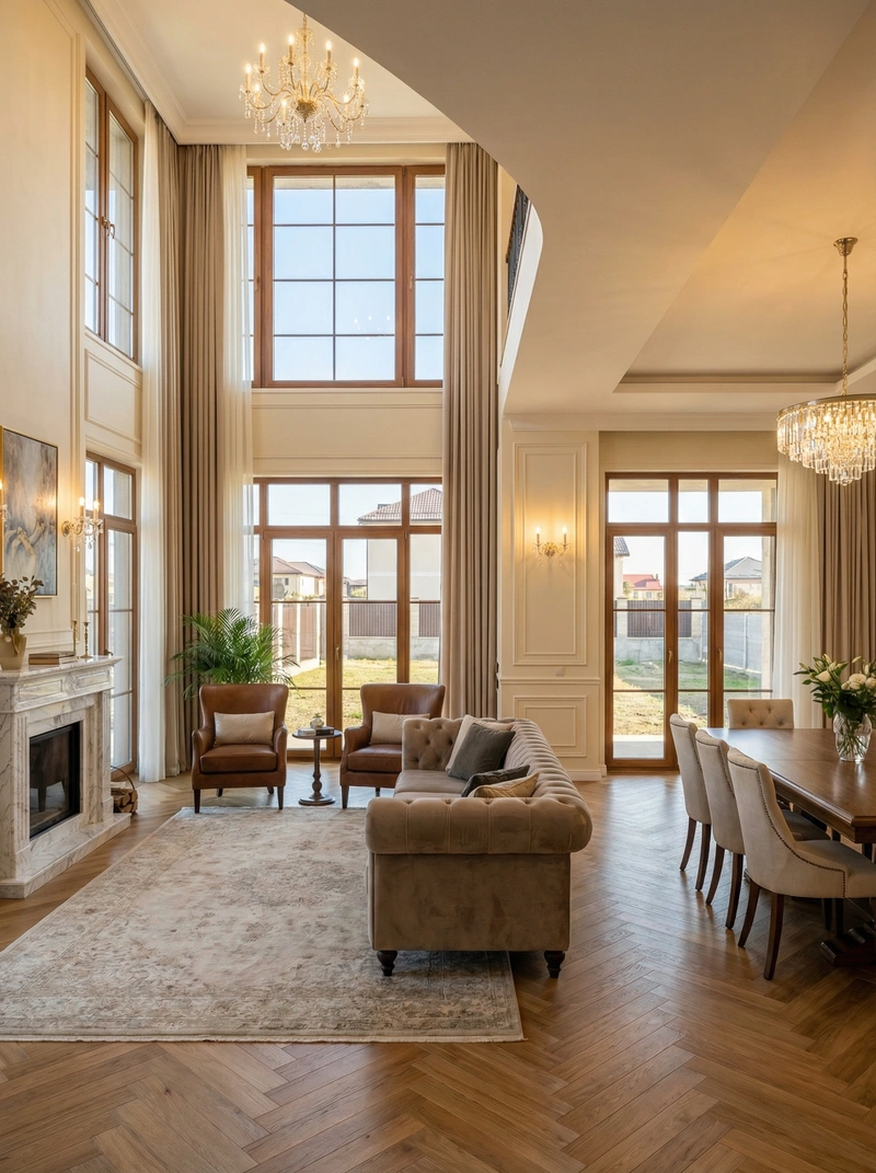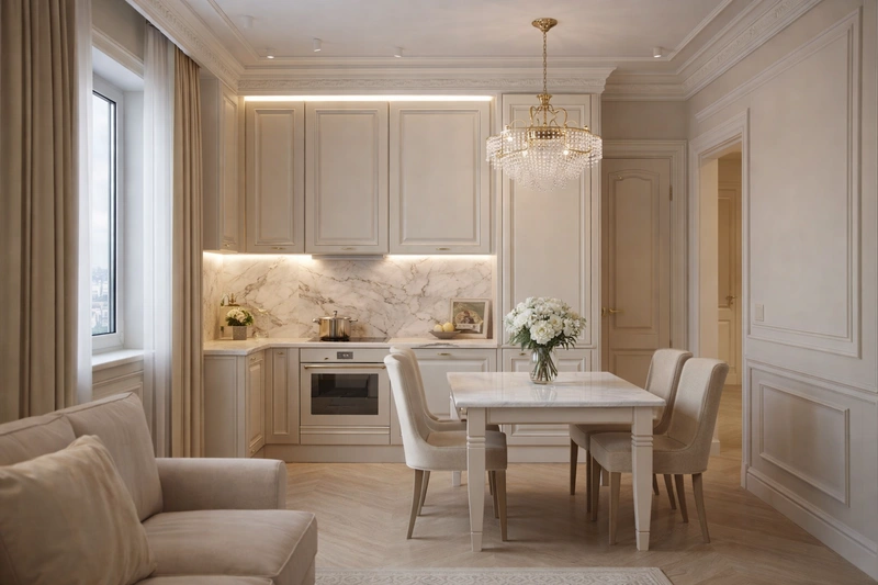 Утончённый стиль с симметрией, лепниной и благородными материалами. Классический интерьер сочетает роскошь и сдержанность, создавая атмосферу вневременной элегантности.