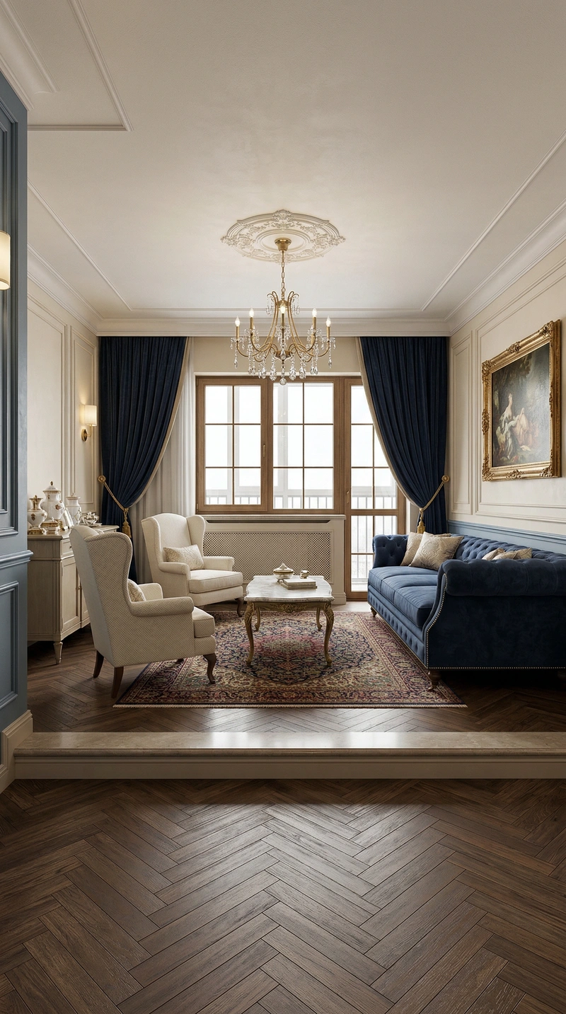 Утончённый стиль с симметрией, лепниной и благородными материалами. Классический интерьер сочетает роскошь и сдержанность, создавая атмосферу вневременной элегантности.