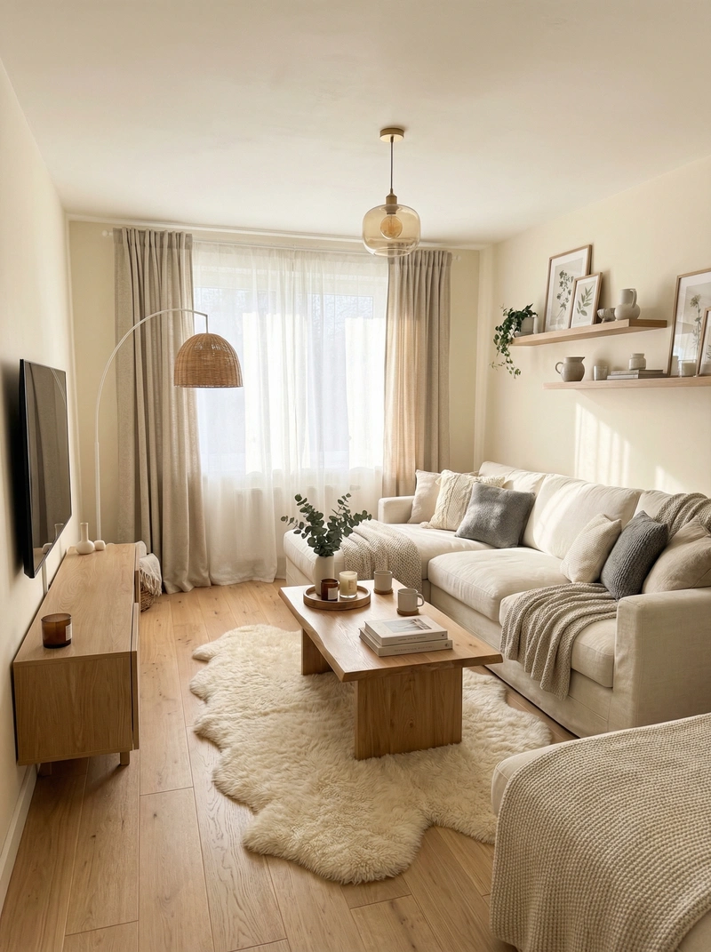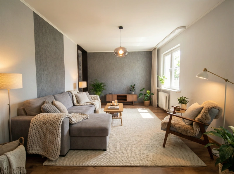Уютный скандинавский стиль с акцентом на комфорт и тёплую атмосферу. Натуральные материалы, мягкие текстуры и приглушённые тона создают ощущение домашнего тепла и спокойствия.