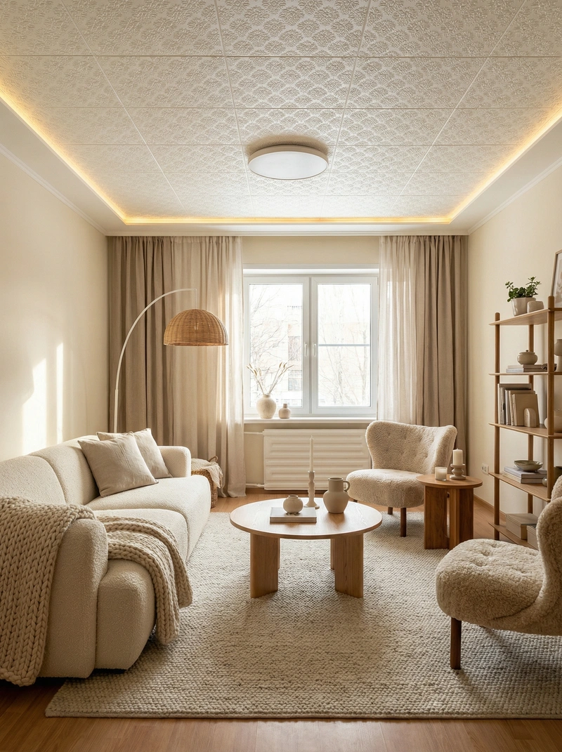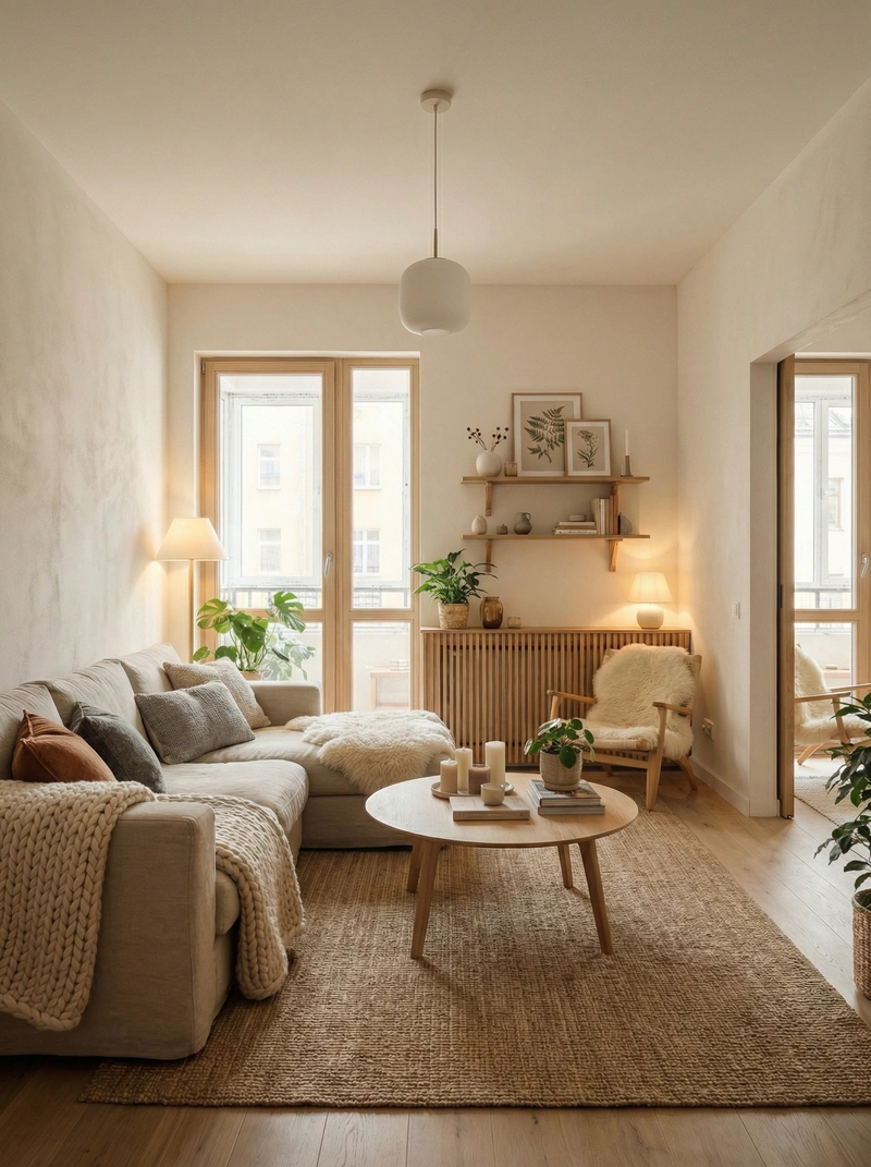 Уютный скандинавский стиль с акцентом на комфорт и тёплую атмосферу. Натуральные материалы, мягкие текстуры и приглушённые тона создают ощущение домашнего тепла и спокойствия.