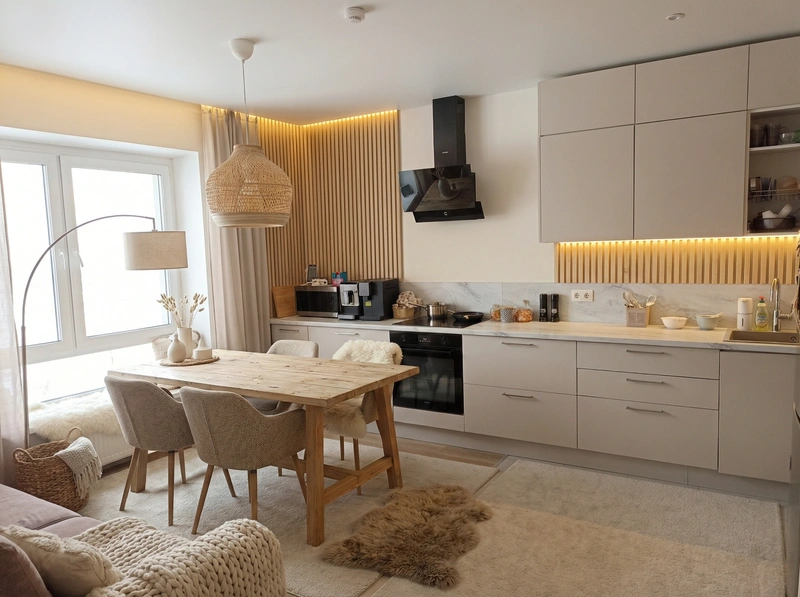 Уютный скандинавский стиль с акцентом на комфорт и тёплую атмосферу. Натуральные материалы, мягкие текстуры и приглушённые тона создают ощущение домашнего тепла и спокойствия.