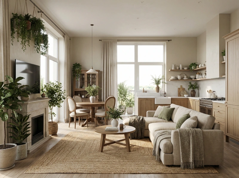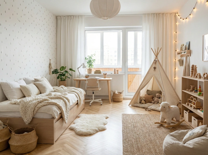 Уютный скандинавский стиль с акцентом на комфорт и тёплую атмосферу. Натуральные материалы, мягкие текстуры и приглушённые тона создают ощущение домашнего тепла и спокойствия.