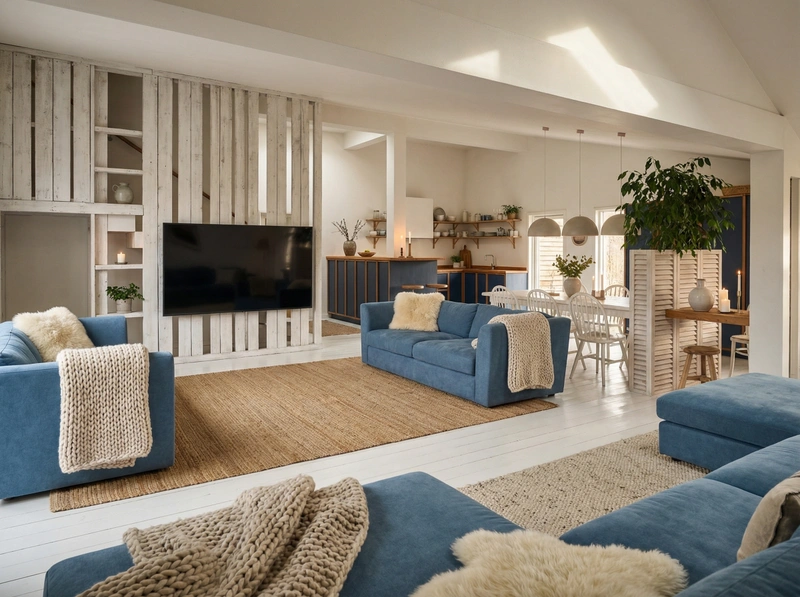 Уютный скандинавский стиль с акцентом на комфорт и тёплую атмосферу. Натуральные материалы, мягкие текстуры и приглушённые тона создают ощущение домашнего тепла и спокойствия.