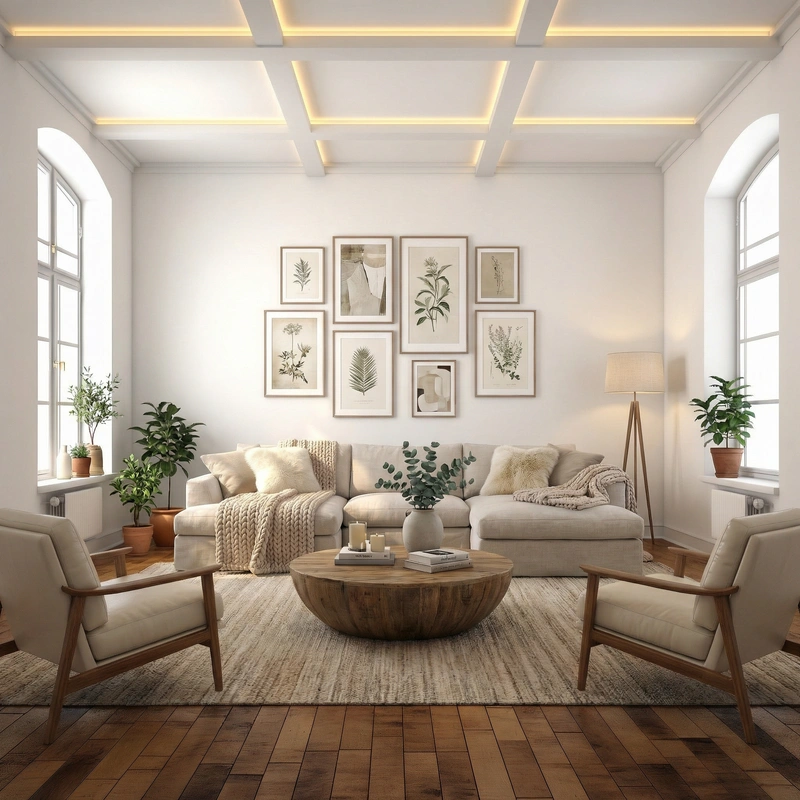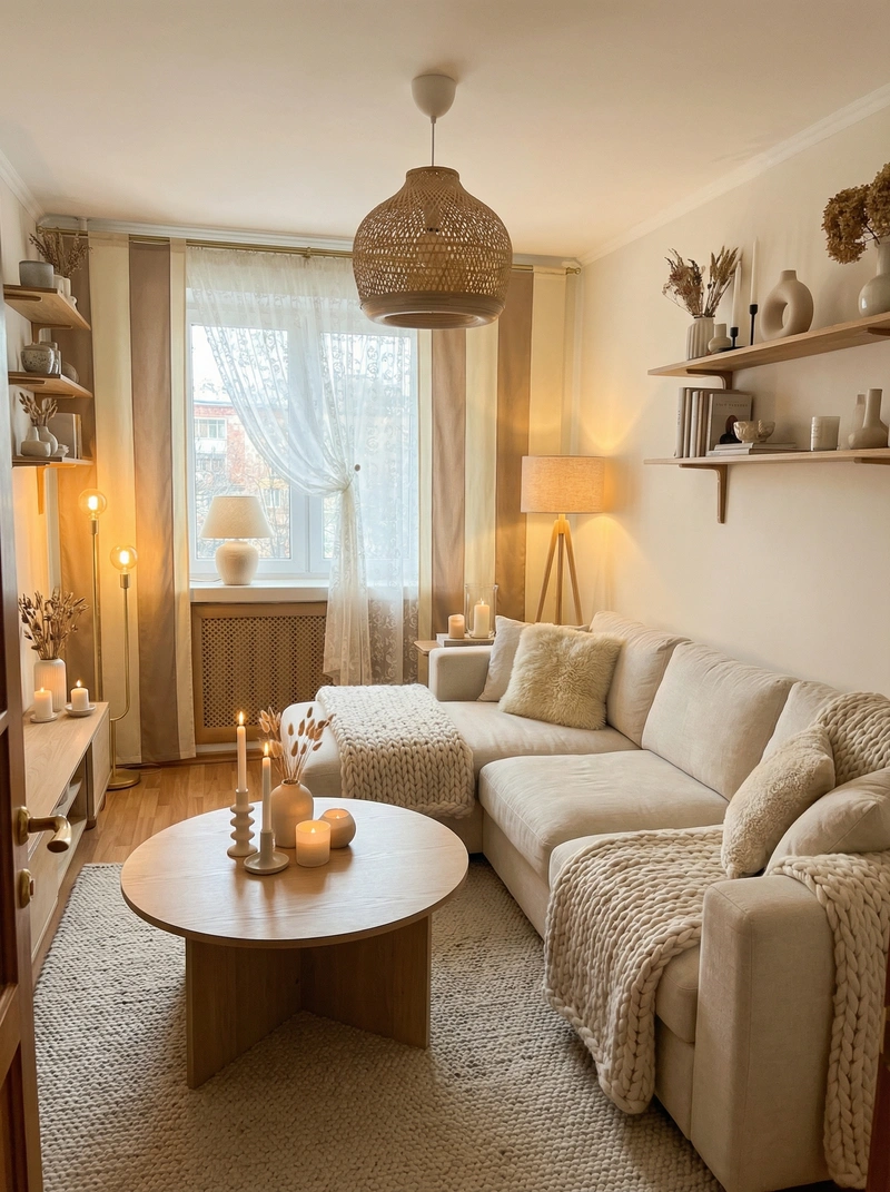 Уютный скандинавский стиль с акцентом на комфорт и тёплую атмосферу. Натуральные материалы, мягкие текстуры и приглушённые тона создают ощущение домашнего тепла и спокойствия.